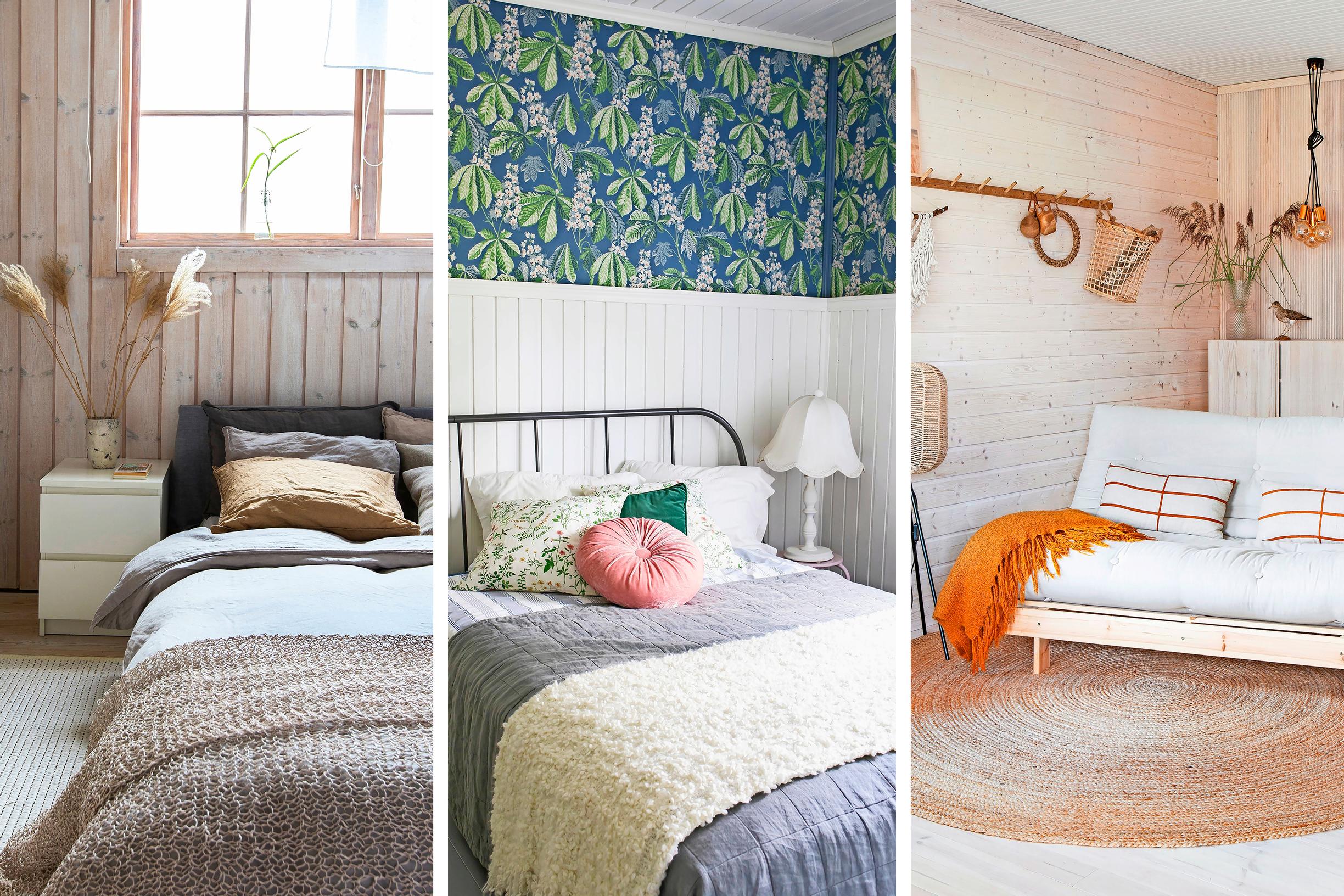 White wainscoting calms and brightens this room wallpapered with a colorful pattern. A good height for the paneling is about 30 centimeters higher than the bed’s headboard—typically the height of the paneling would be 150–170 centimeters. The wallpaper is ‘Chestnut Blossom’ by Boråstapeter.