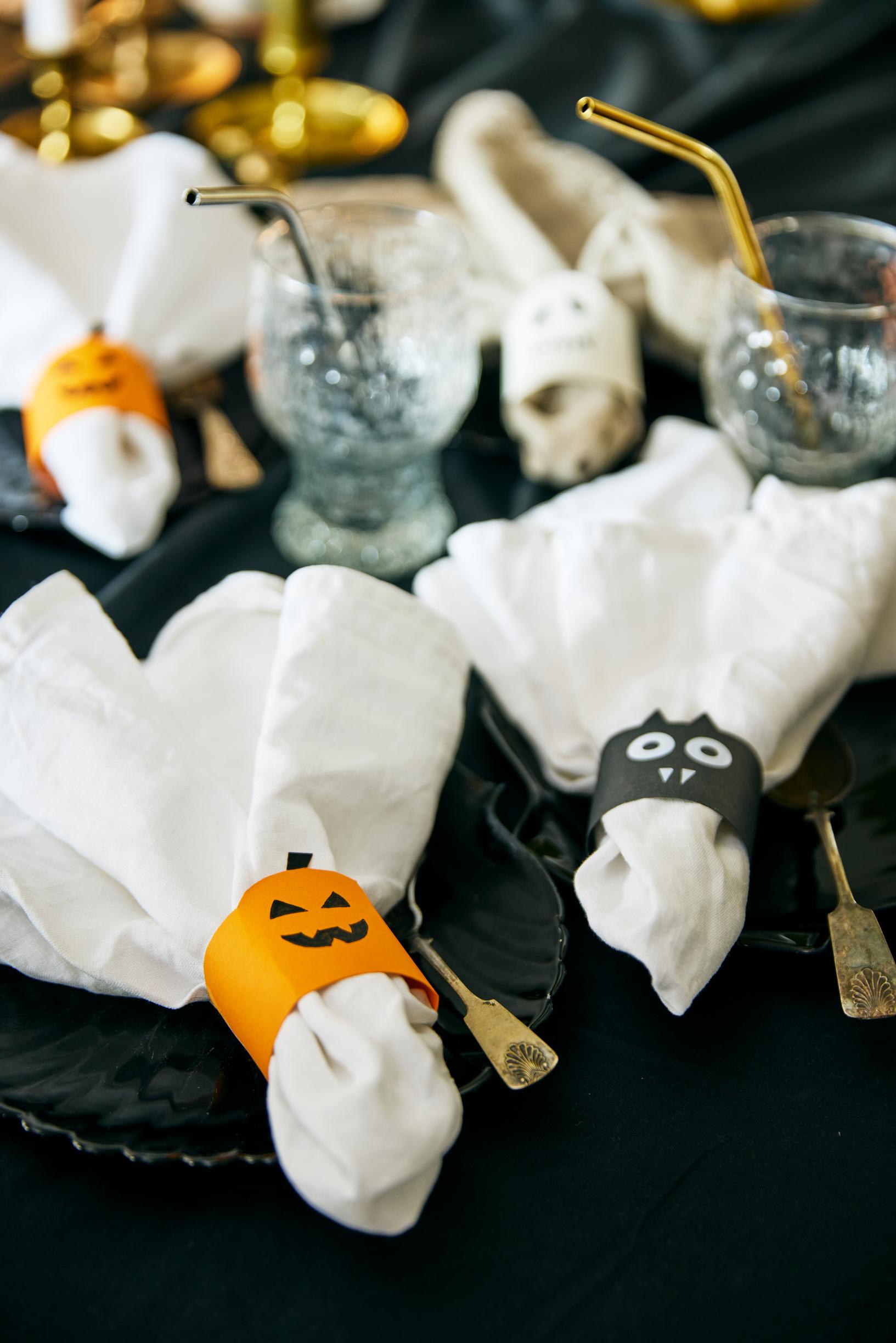Easy napkin rings add a stylish yet spooky final touch to your table. Cut 4.5 × 17 cm (1.8 × 6.7 in) strips of cardstock. In the middle of each strip, shape a pumpkin stem, the top of a ghost’s head, or bat ears. Draw in details with a marker, curve each strip into a ring, and tape it closed. Afterward, just remove the tape and store the rings flat for next time.