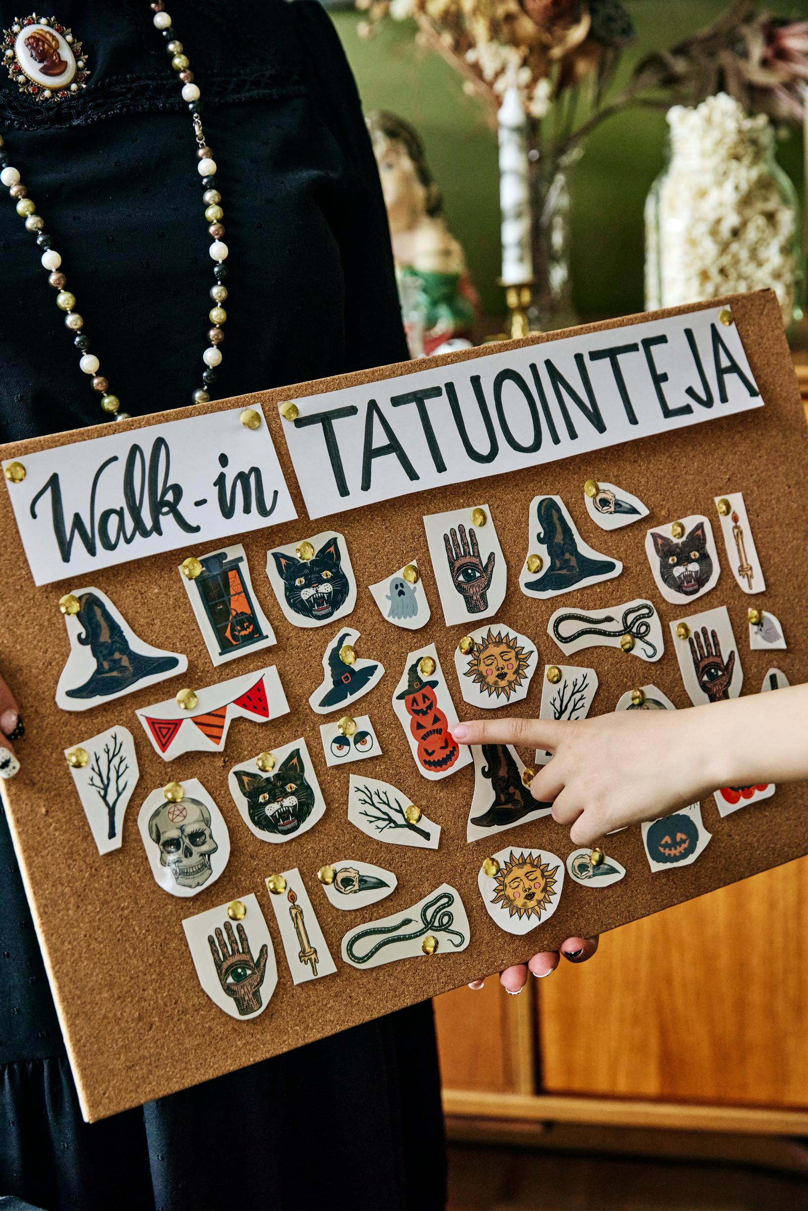 A timeless highlight at children’s parties is the walk-in tattoo studio. I cut out designs from Halloween-themed temporary tattoo sheets and pinned them onto a corkboard. Then kids can choose their favorite tattoos—just like at a real walk-in day.