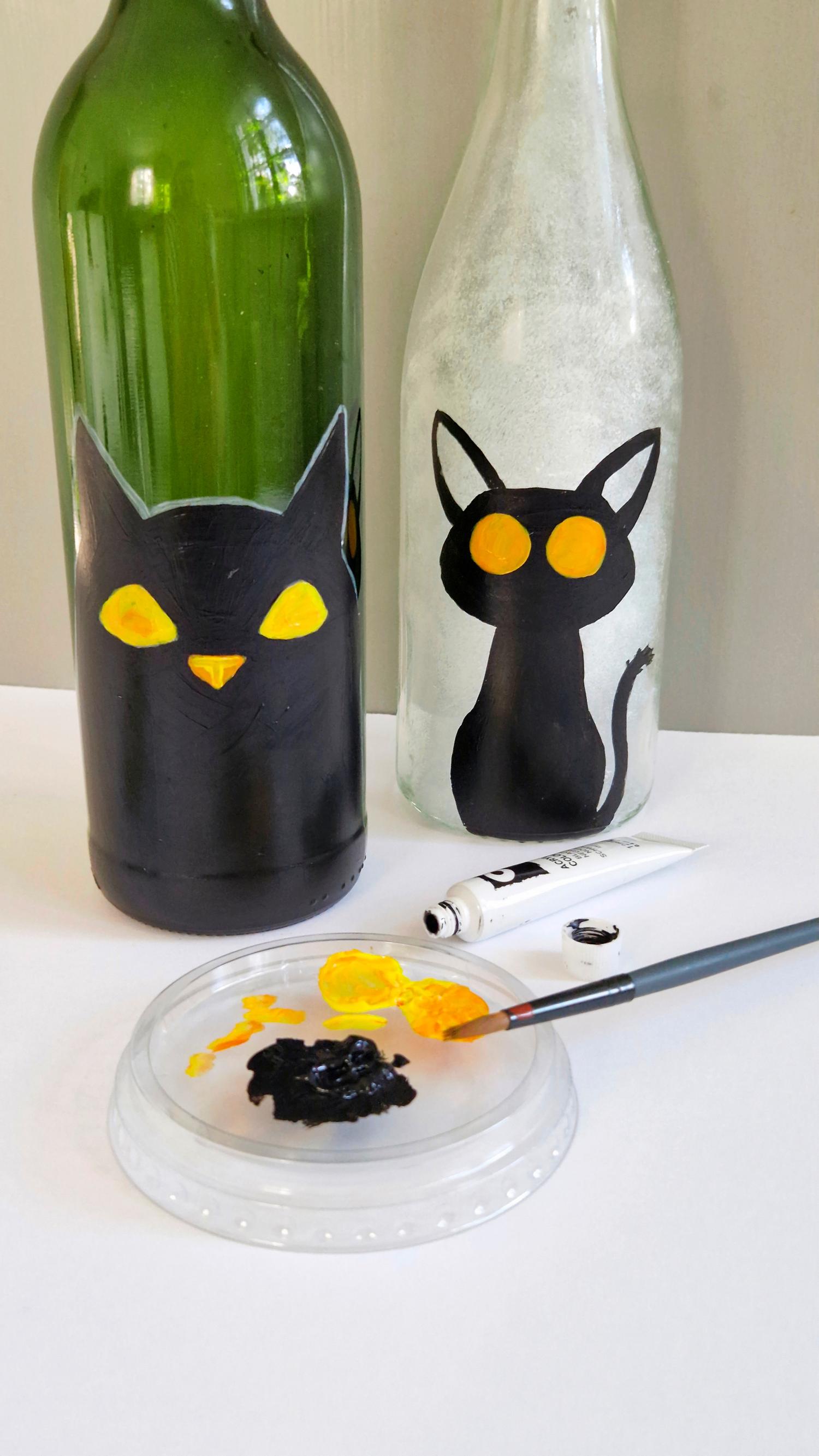 Get ready for Halloween by painting some scary-looking bottles. When you add a string of lights inside, the cats and other oddities shine with an extra glow.