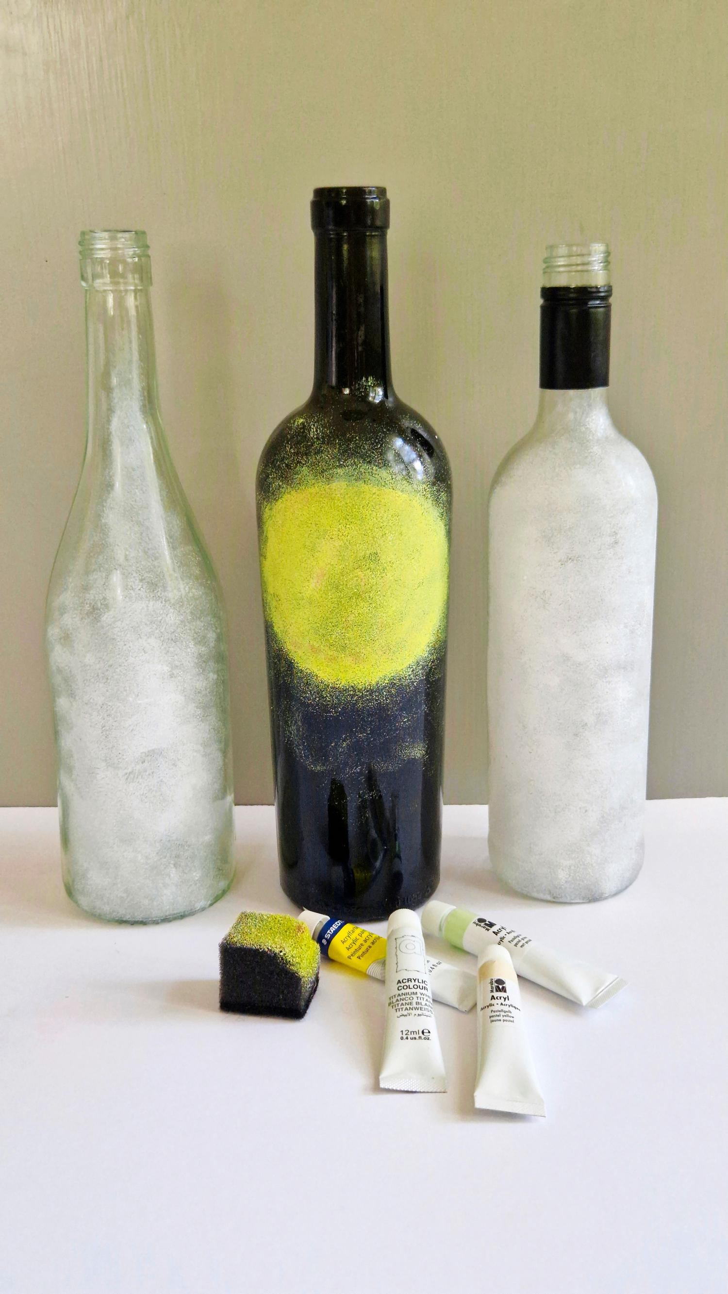1. Soak the bottle until the label peels off. It also comes off easily if you warm the bottle briefly in the oven. Before painting, make sure there are no greasy marks or glue left on the glass.