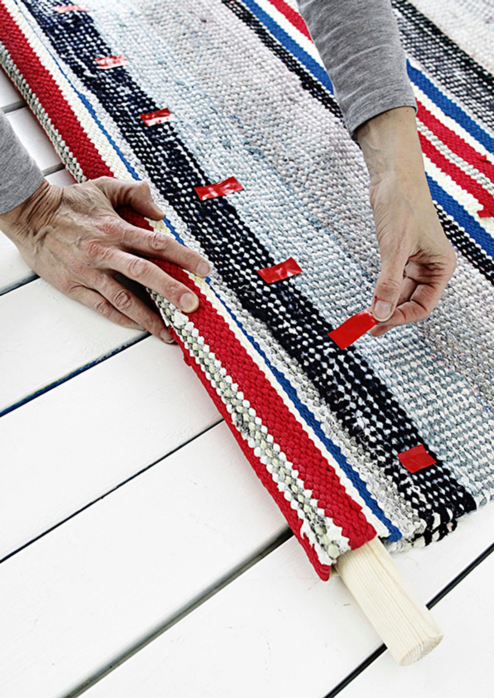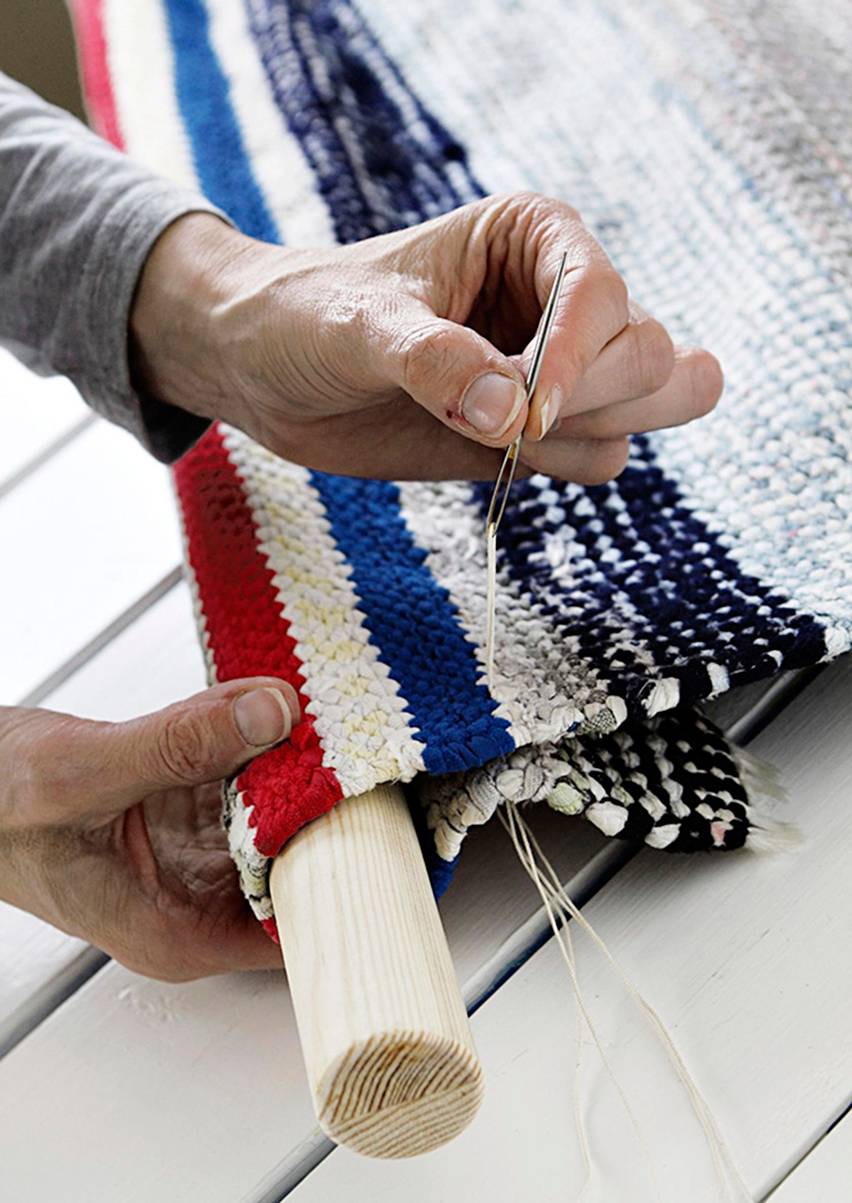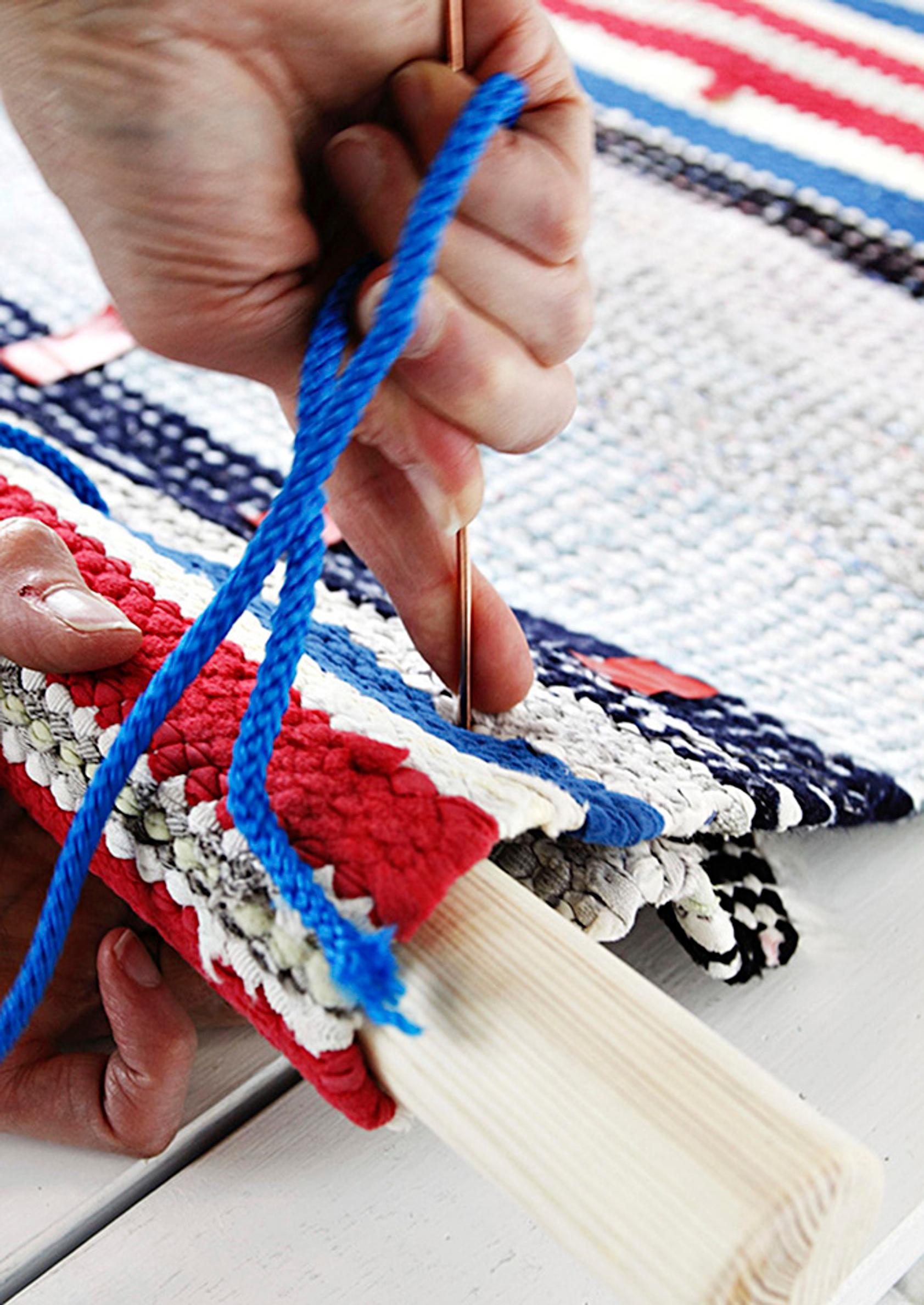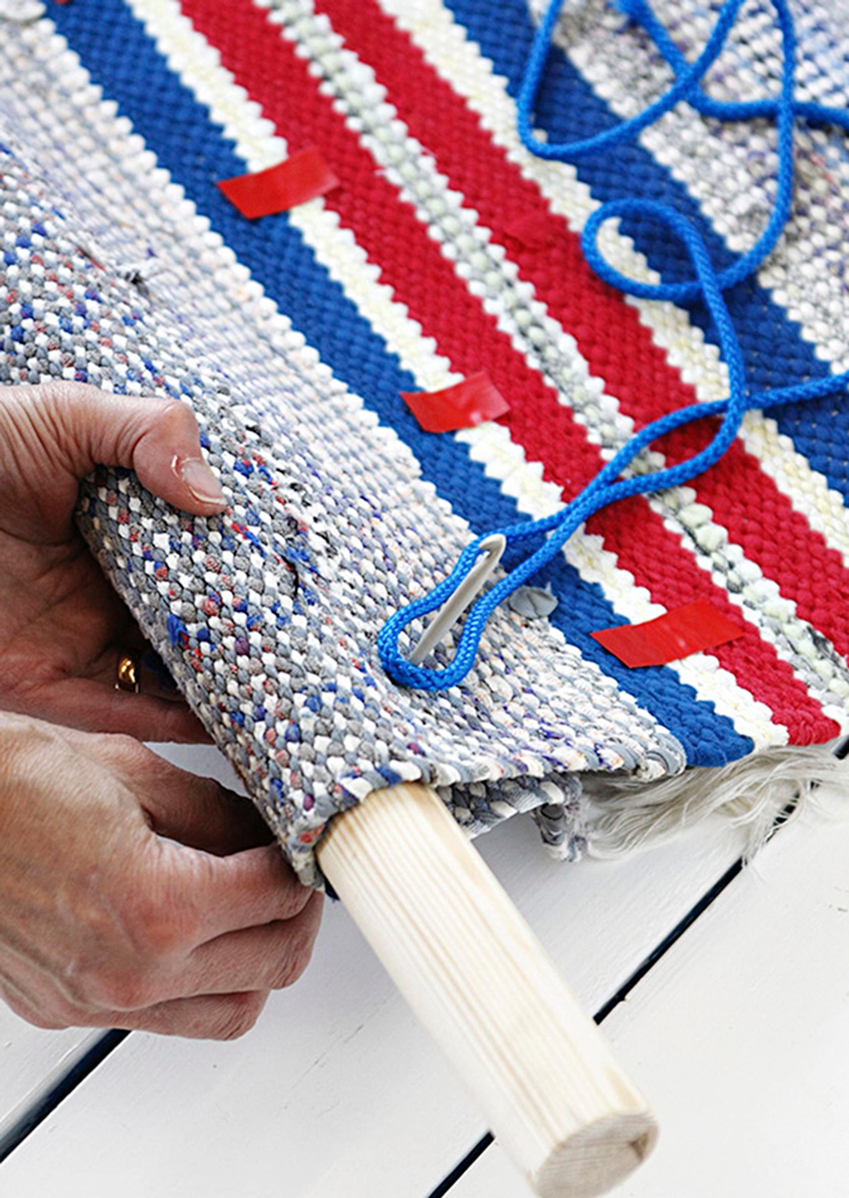 1. Use a sturdy darning needle and fishing line to sew wide channels at both ends of the rag rug so the rods can pass through easily. Use loose stitches, and reinforce them two or three times at each end.
