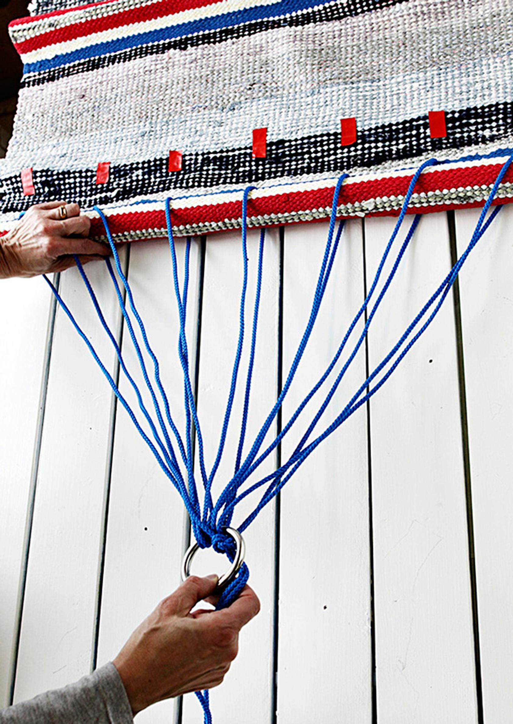 You can get ropes and dowels at hardware stores, and you’ll find O-rings and carabiners at marine supply shops. Thanks to the carabiners, the rug is easy to take down and set up again in your favorite spot. If you want to use the rugs on the floor later, simply remove the ropes, undo the channel seams, and place the rugs on the floor.