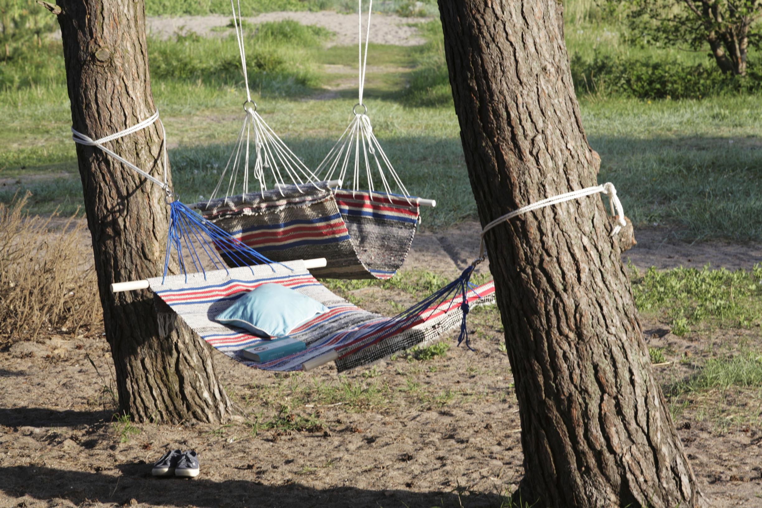 With just a couple of spare rag rugs, you can easily make hammocks for your summer yard. These hammocks are sturdy and safe because the ropes aren’t dependent solely on the rug’s weft—they also loop around the dowel at every fastening point. You can cut a sturdy round dowel in half to create rods for the rug. You can paint them with outdoor furniture paint or treat them with tinted wood oil.