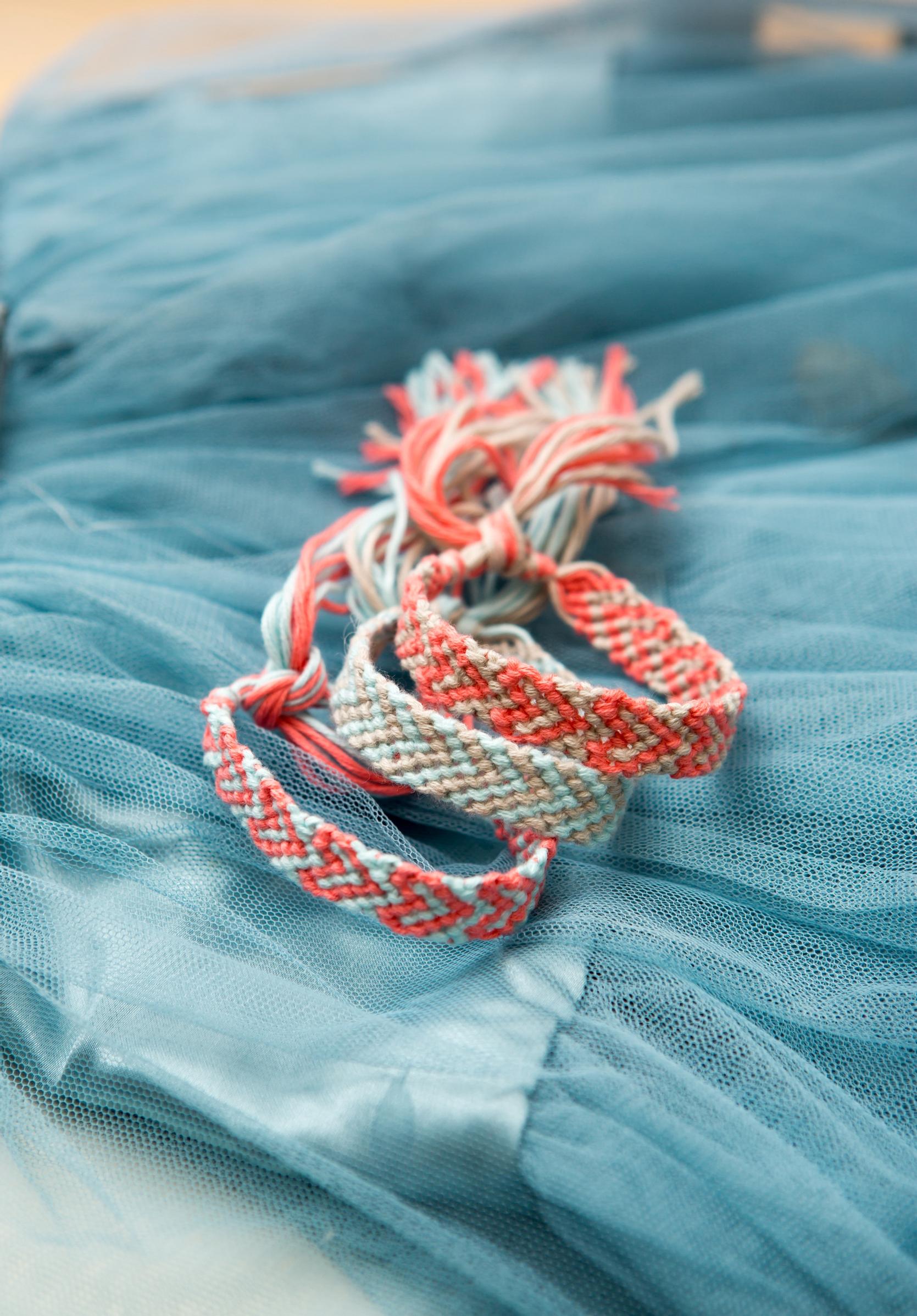 There are many ways to create a friendship bracelet. These delightful versions feature a herringbone pattern and small hearts. Thin, loosely spun knitting or embroidery threads work well.