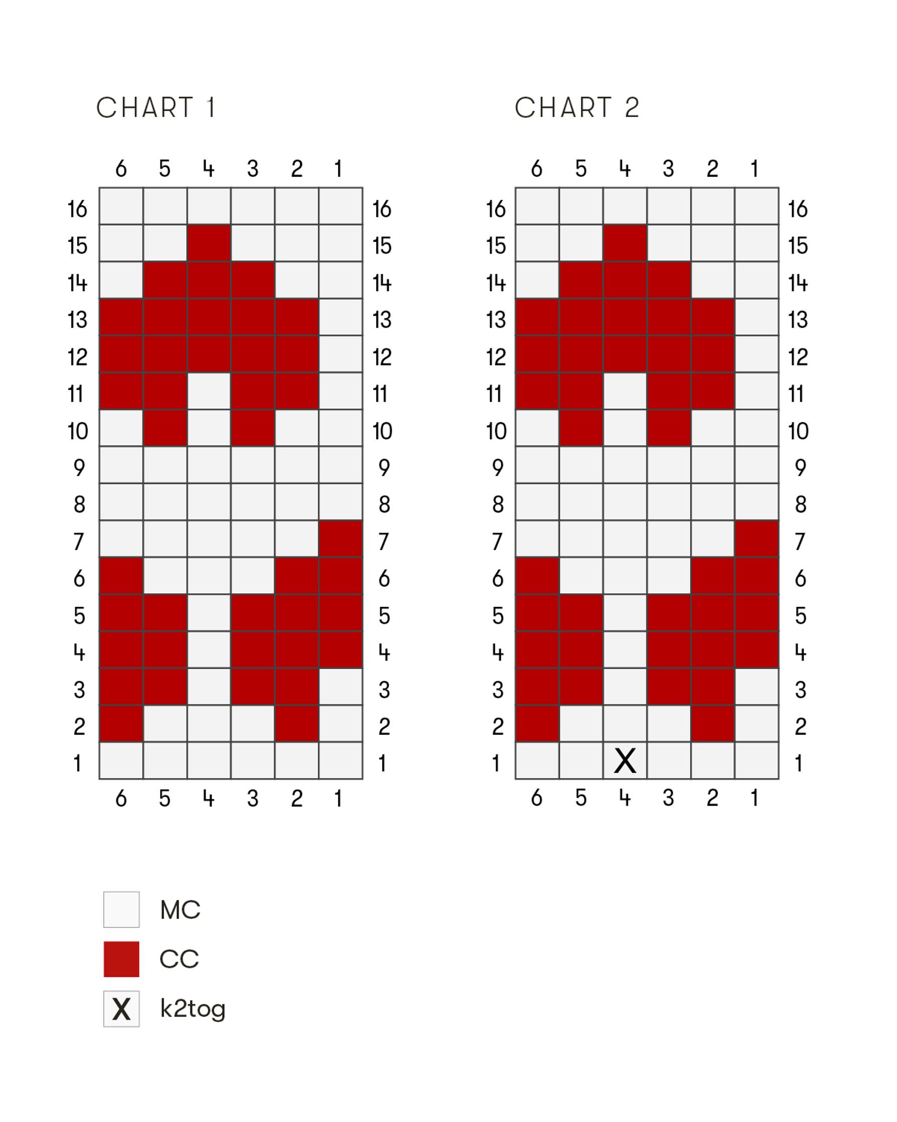 From now on, on the first rnd of the heart chart, work the leg decreases. The chart remains the same, but dec 6 sts each first rnd. In chart 2, a cross marks a good spot for these decs so they stay discreet.