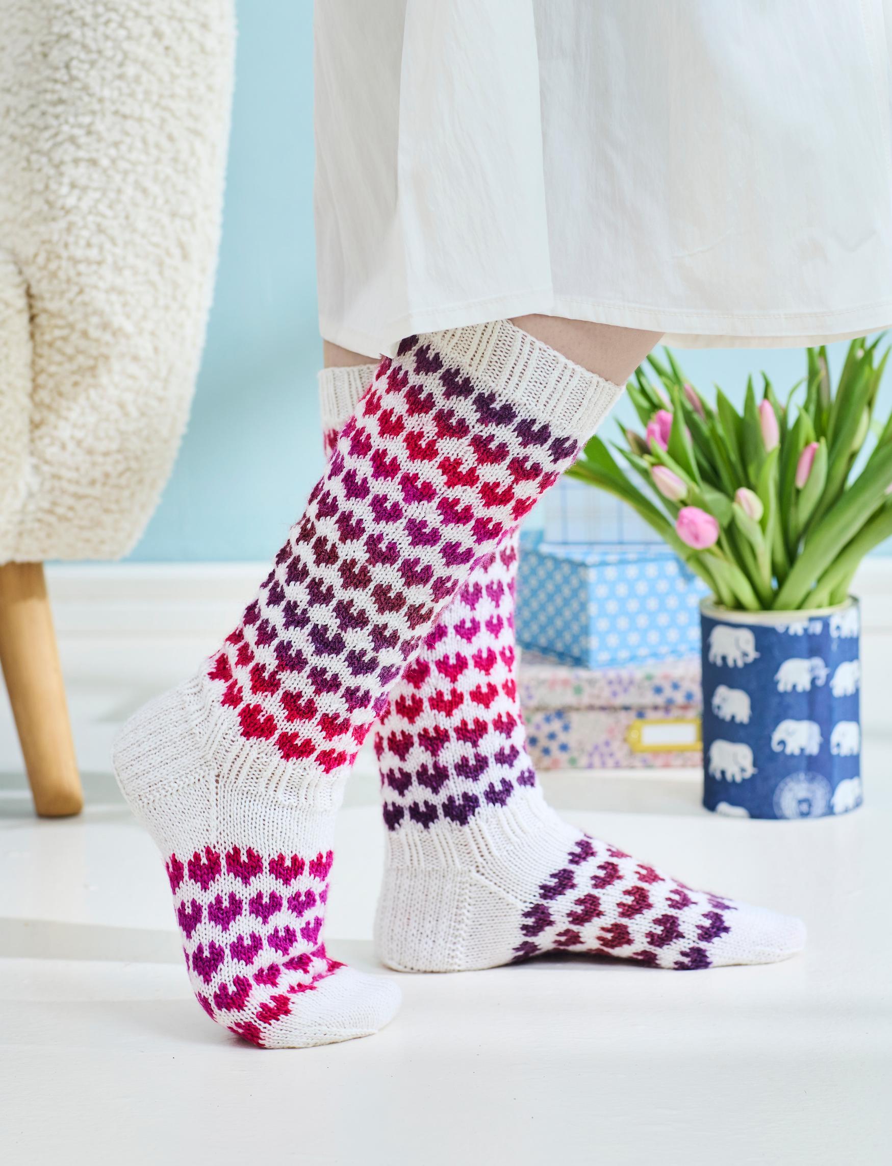 The adorable Heart socks are knitted with a multicolored yarn that softly transitions from one shade to the next. Their long-leg design makes them a wonderfully warm gift for a friend or a loved one.