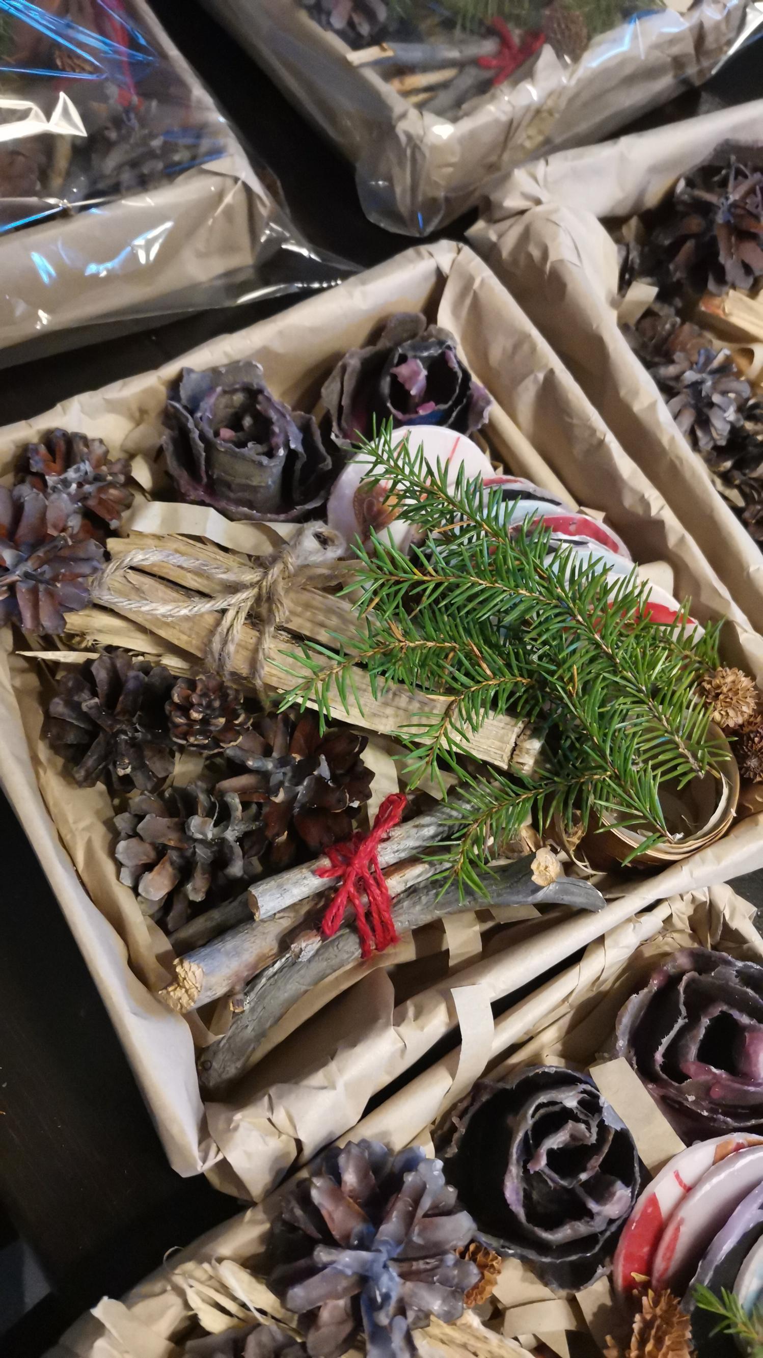 On a fire starter tray, you can combine all sorts of starters, from chips to items collected from nature. Sanna gathered small pieces of birch bark, sticks, cones, and little sprigs or branches of evergreens. She dipped the cones in wax along with her rose-shaped and chip-style fire starters.