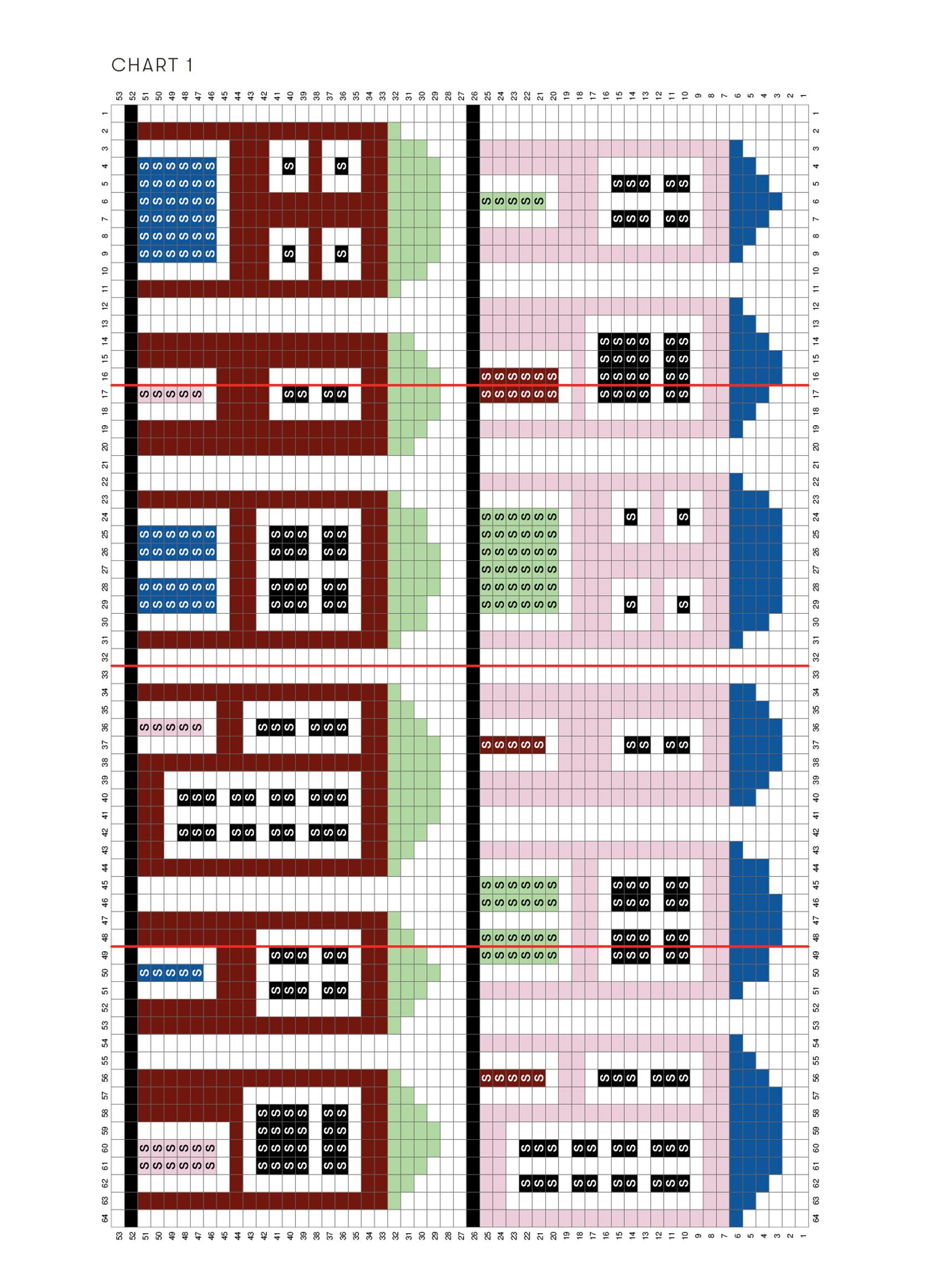 - After completing the chart, you have 64 sts. Adjust the st distribution to 16/16/16/16 as needed. Continue with white. Knit 1 rnd. On the next rnd, decrease four sts total, leaving 60 sts, distributed as 15/15/15/15.