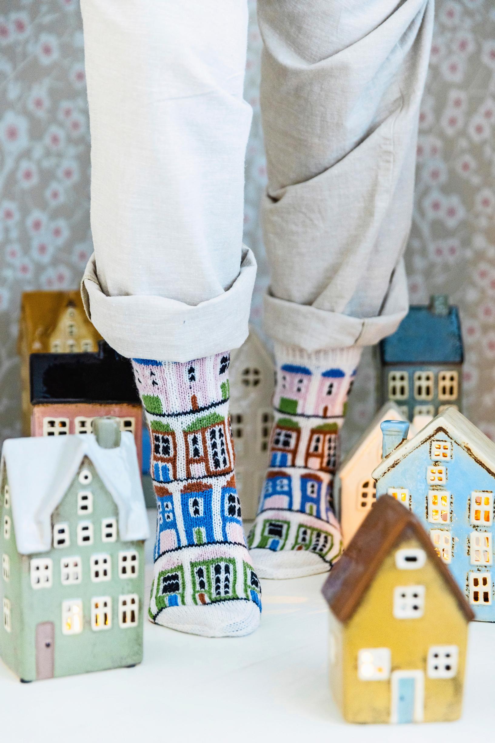 Light the room with these lovely house lantern socks! The easy colorwork motif is finished by embroidering the details with duplicate stitch.