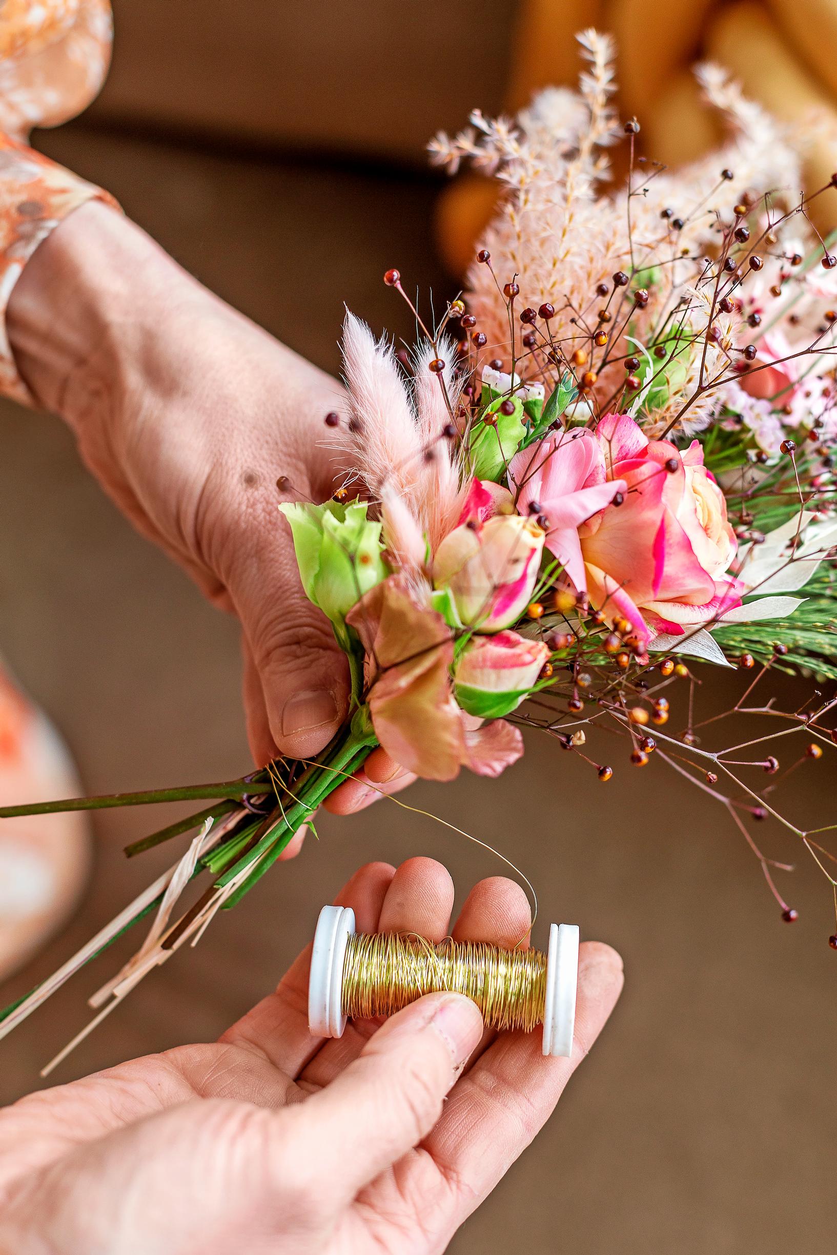 2. Cut the flower stems to about five centimeters. Take a small bundle of flowers and grasses in your hand and attach them to the base with thin wire. Wrap the wire around the stems a few times and gently pull it taut. Let the grasses extend freely, and allow the crown to remain slightly asymmetrical.