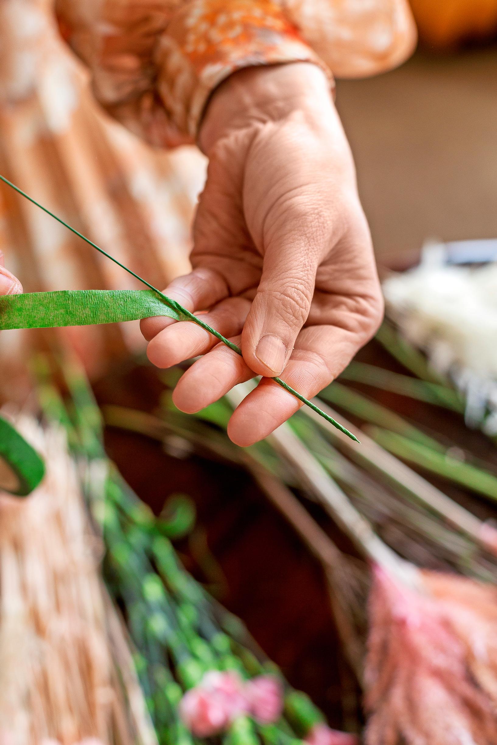 3. Once your wreath reaches the right size, try it on to be sure. Then trim the remaining stems and secure the wire.