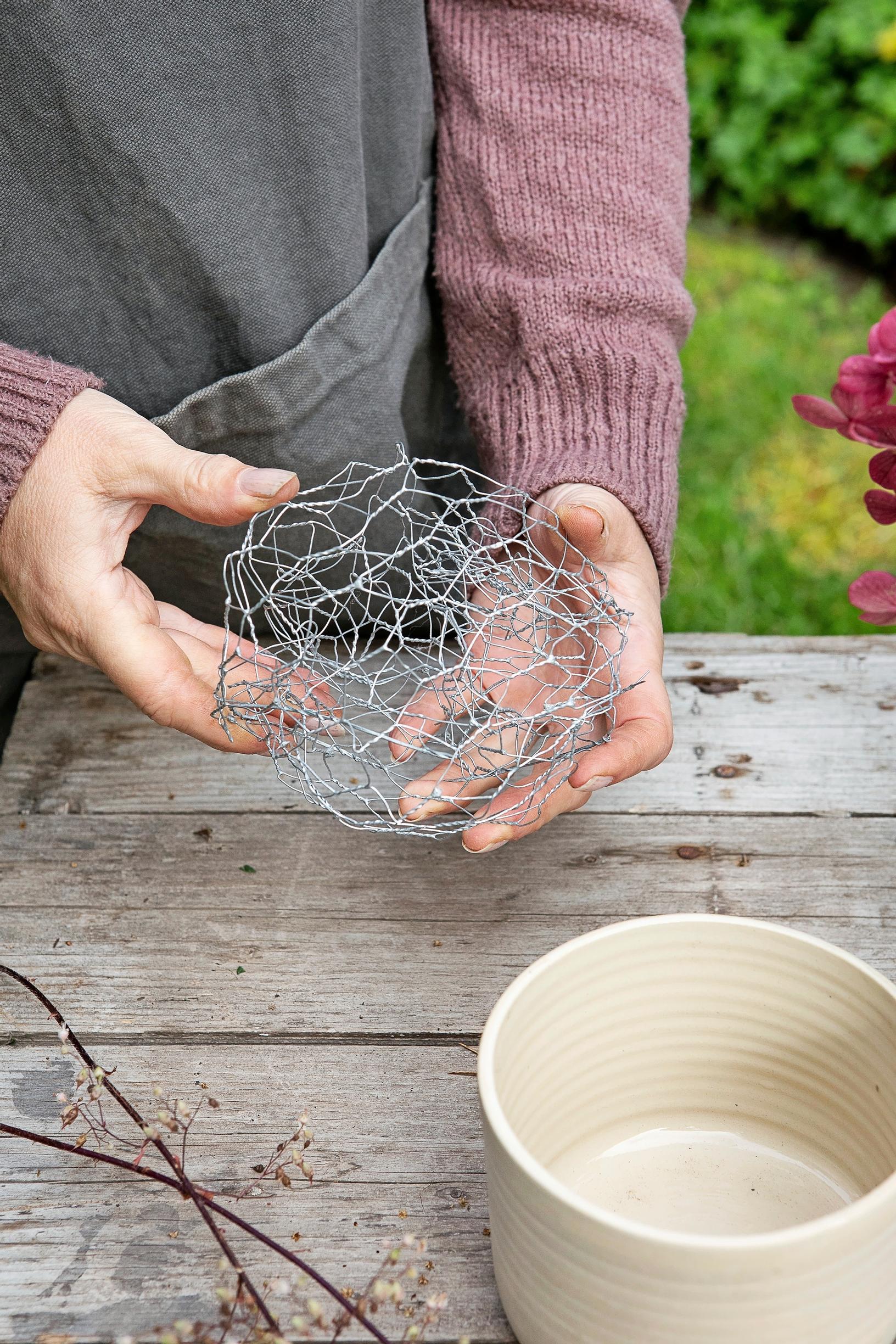 2. Place the chicken wire ball into the container. If needed, secure it with floral tape so it doesn’t shift.