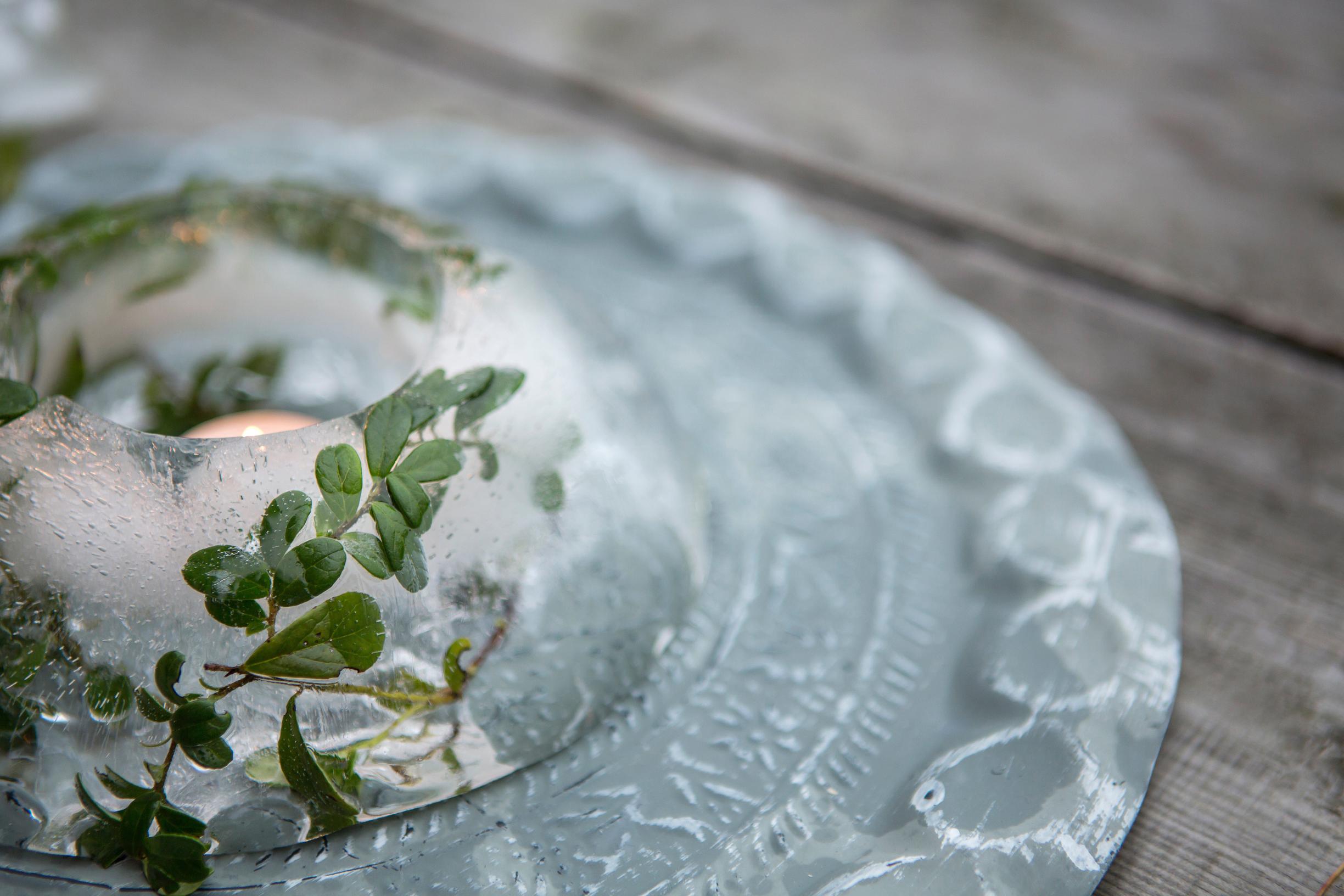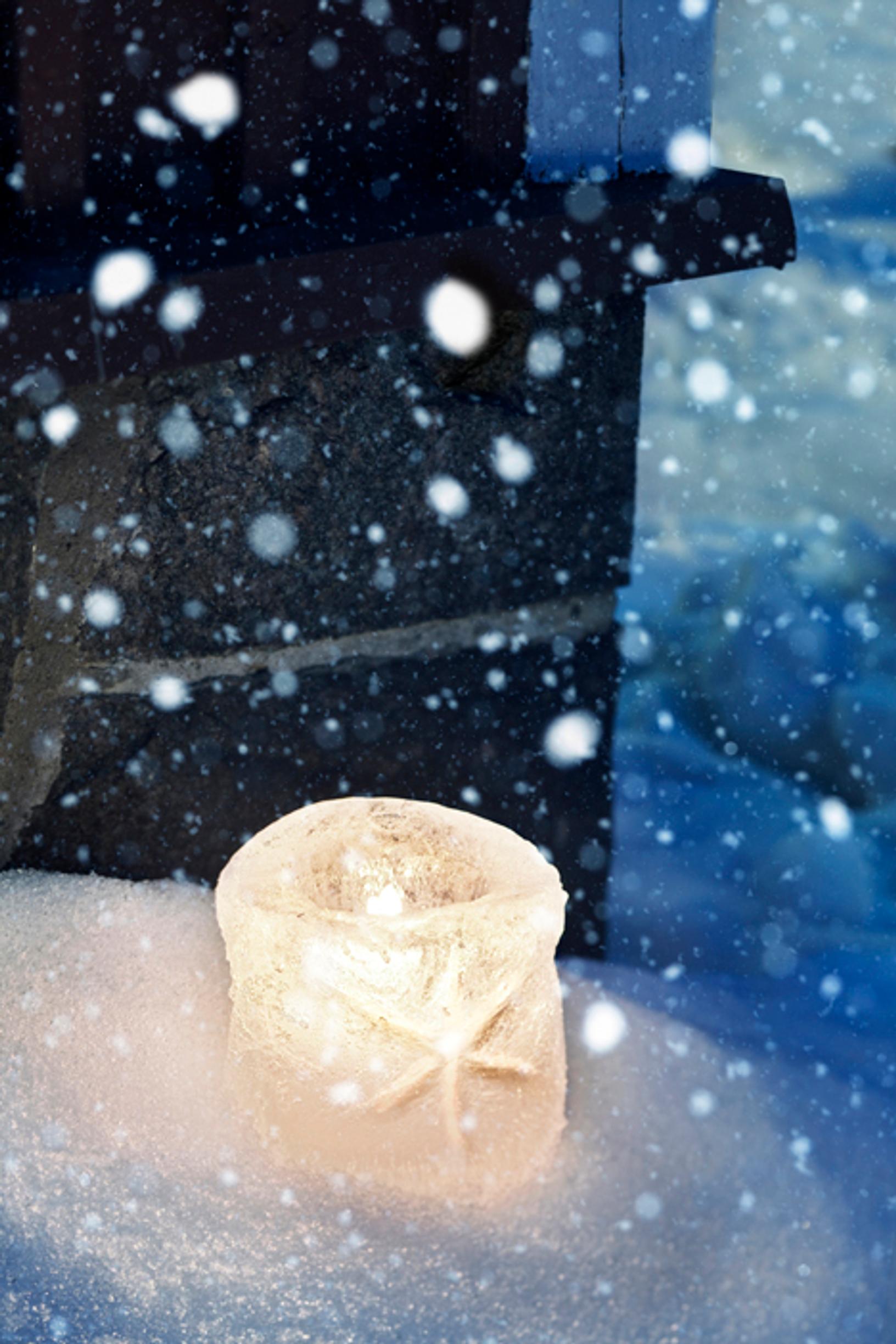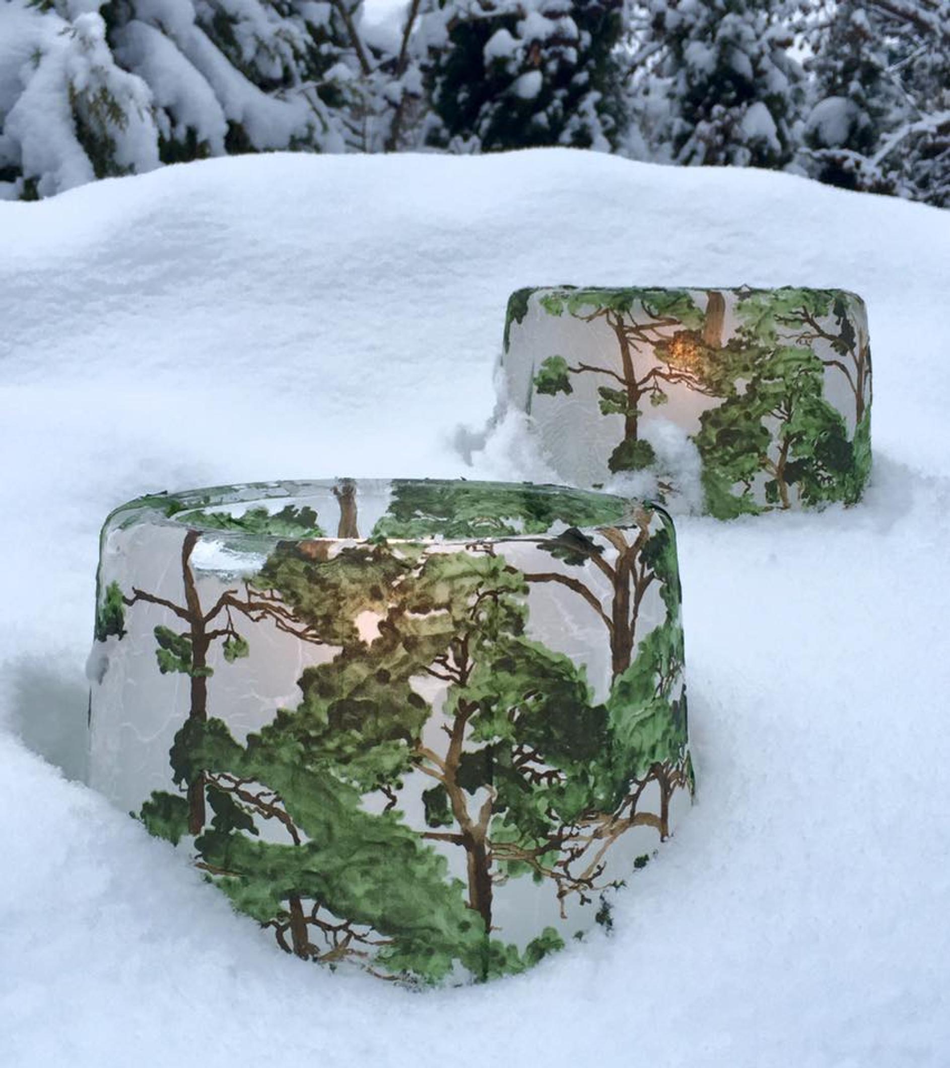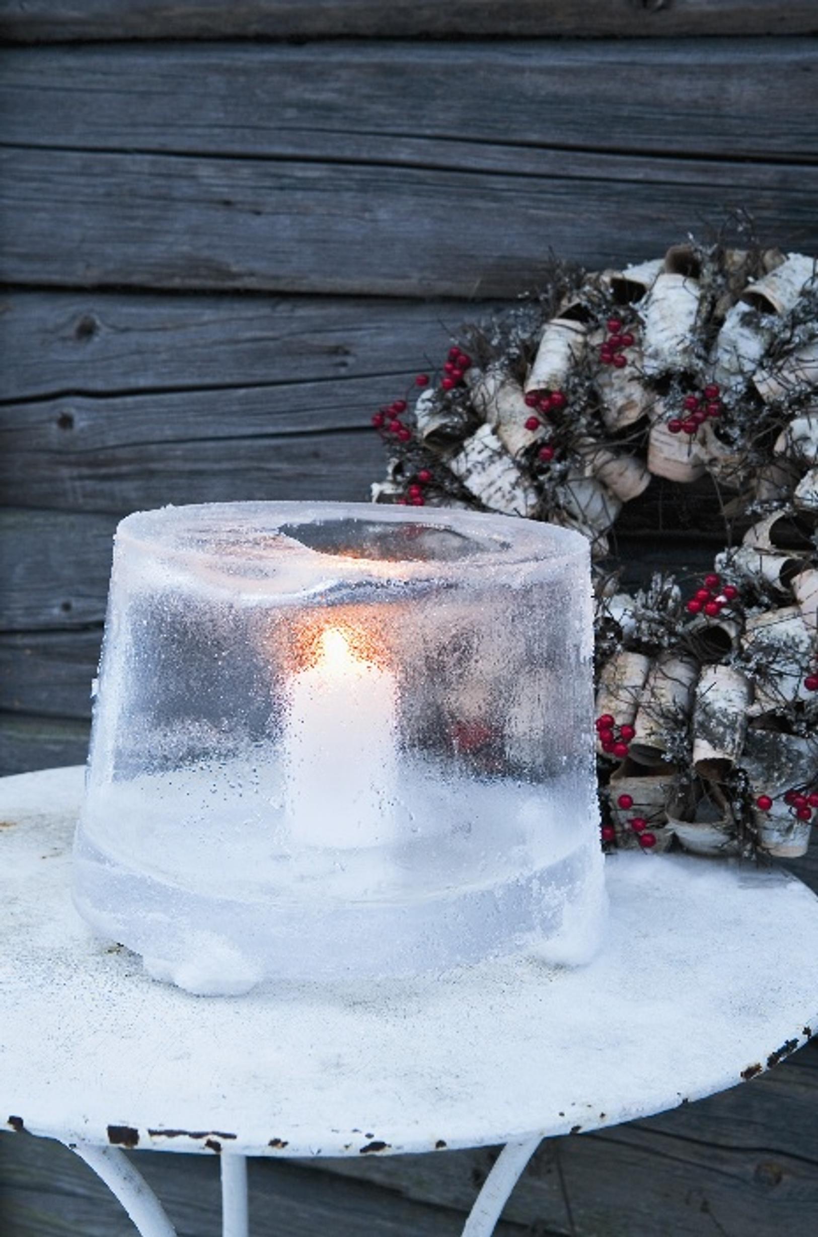 Make the ice lantern by freezing water in a bucket overnight. In the morning, gently remove the ice lantern with warm water. Make an opening for a candle and pour out any water inside. Choose a napkin you like; the ice lanterns in the photo feature Erja Hirvi’s ‘Hongisto’ design. If the napkins are thick, it’s best to use only the outermost layer, which is thin enough for light to shine through beautifully. Cut the napkin to an appropriate size and gently attach it to the outside of the ice lantern with water. You can use a spray bottle for this. (Tip provided by Ulla Tuomela)