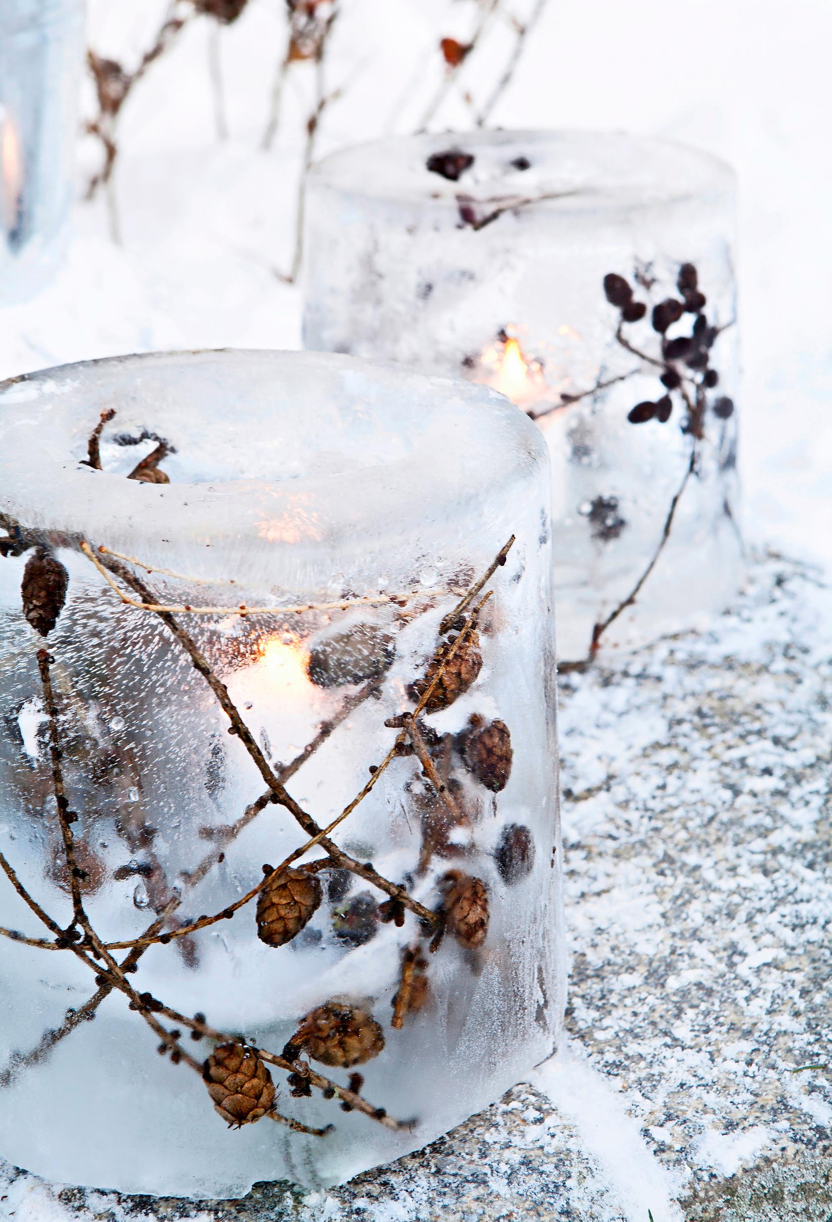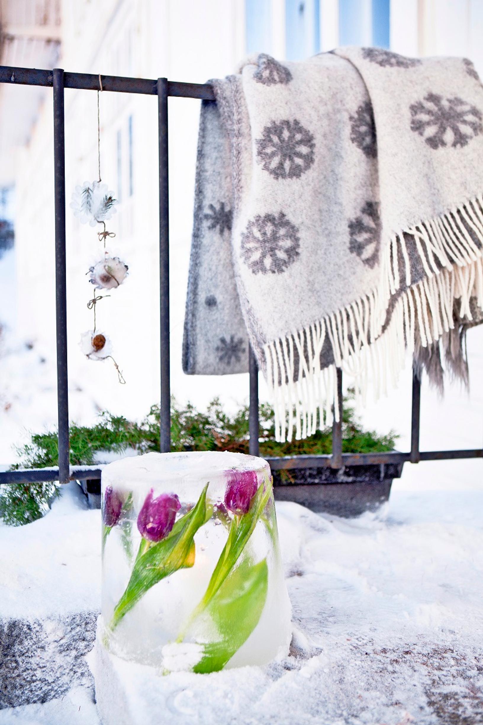 Even slightly wilted tulips can find a new purpose when you put them in an ice lantern. Place the tulip upside down in a bucket and secure it at the edges with clothespins. Carefully fill the bucket with water, a little at a time. Gently swirl to remove air bubbles and let it freeze. You can also freeze flowers or pinecones in small molds and connect the pieces with strings to create a garland.