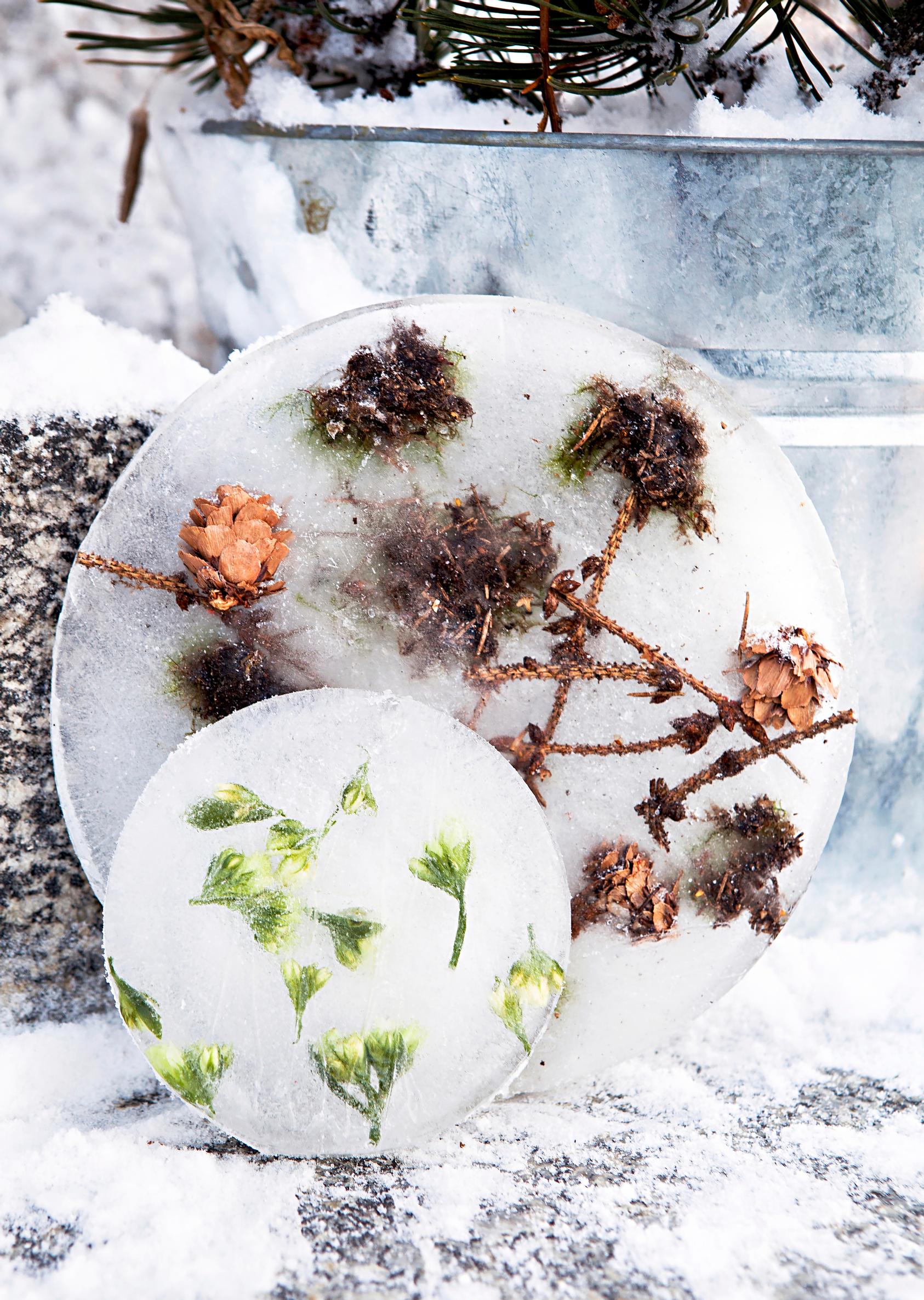 When it comes to freezing ice decorations, the only limit is your imagination. You can use almost any materials. It’s a good idea to collect stones, pinecones, moss, and berries in the autumn so that you have them before the freezing temperatures arrive. Remember to check if you need the landowner’s permission to collect branches, moss, or soil materials.
