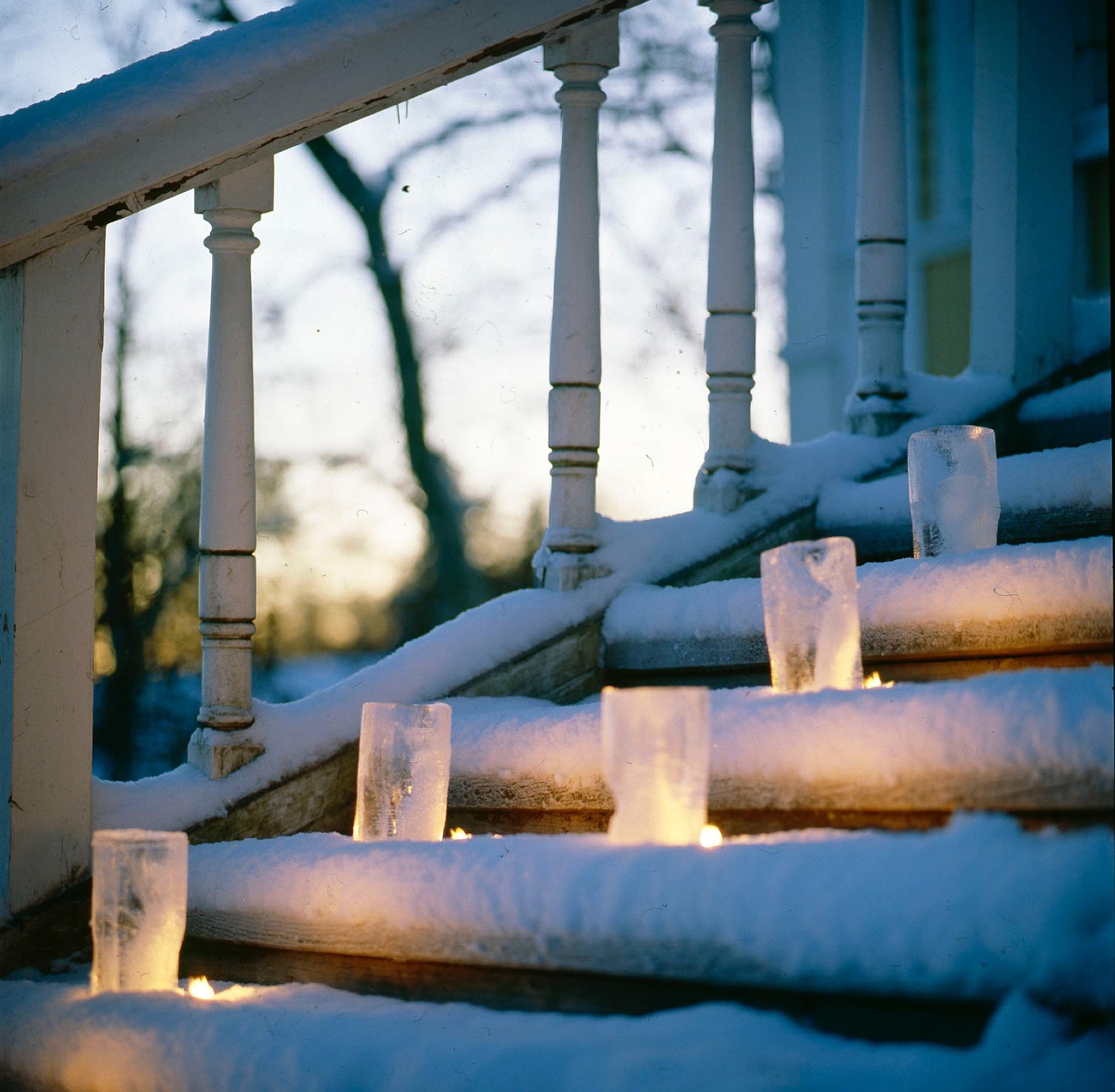 A bright, brick-shaped DIY ice lantern is easy to make from old milk cartons. Fill the milk cartons with water and freeze them outside. Once the water has frozen, remove the milk carton from around the ice brick. Arrange the bricks on stairs or assemble them into a snow lantern formation. If you’re making a formation, put a little snow between the bricks. Dip the blocks in water if necessary to help them stick together. Put outdoor candles or electric lights inside the ice structure.