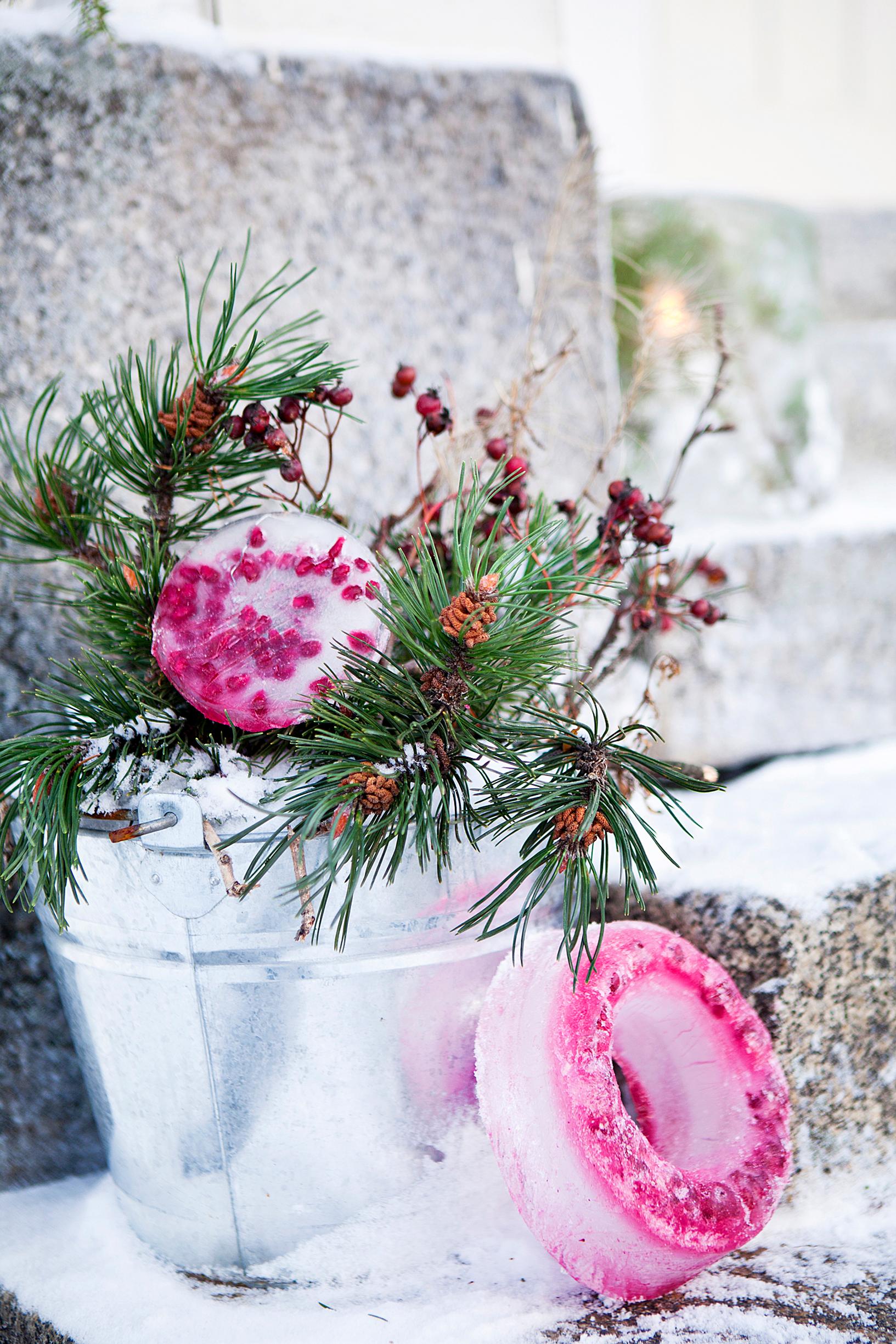 You can color your ice lanterns with berries and juice. Pomegranate seeds create clear patterns because they don’t easily release juice.
