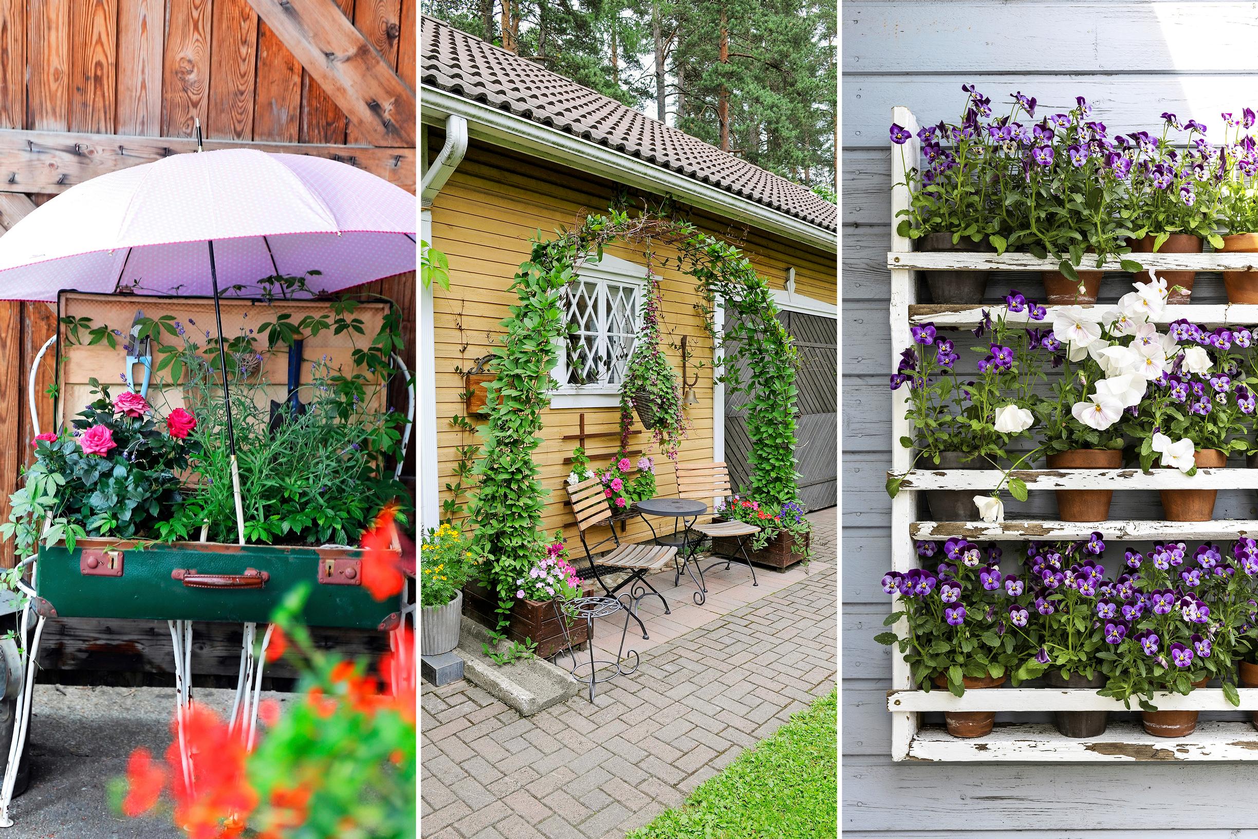 Summer flowers are delightful at entrances, on patios, and even on balconies. They can be planted creatively in an old suitcase, a washing machine drum, and more.