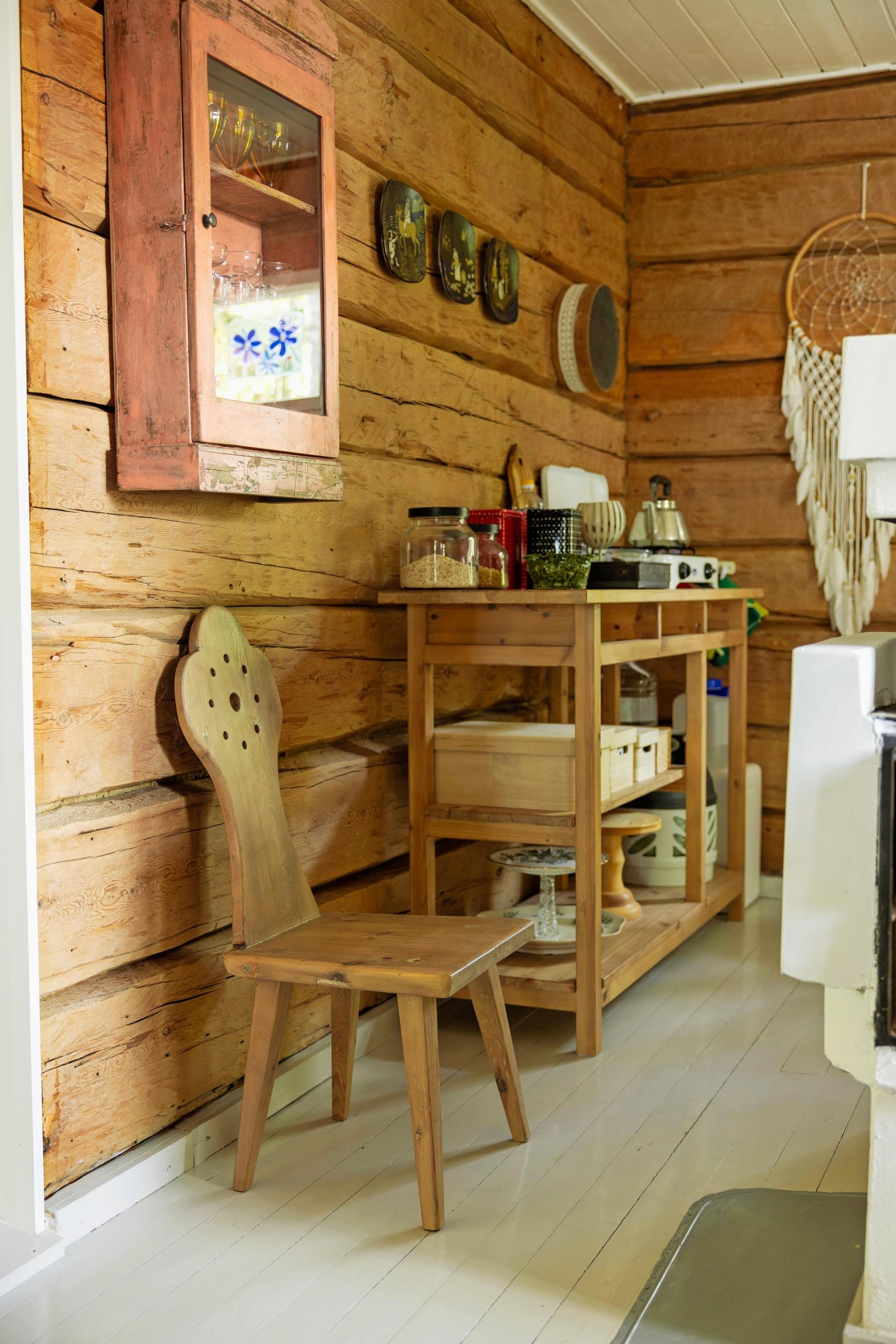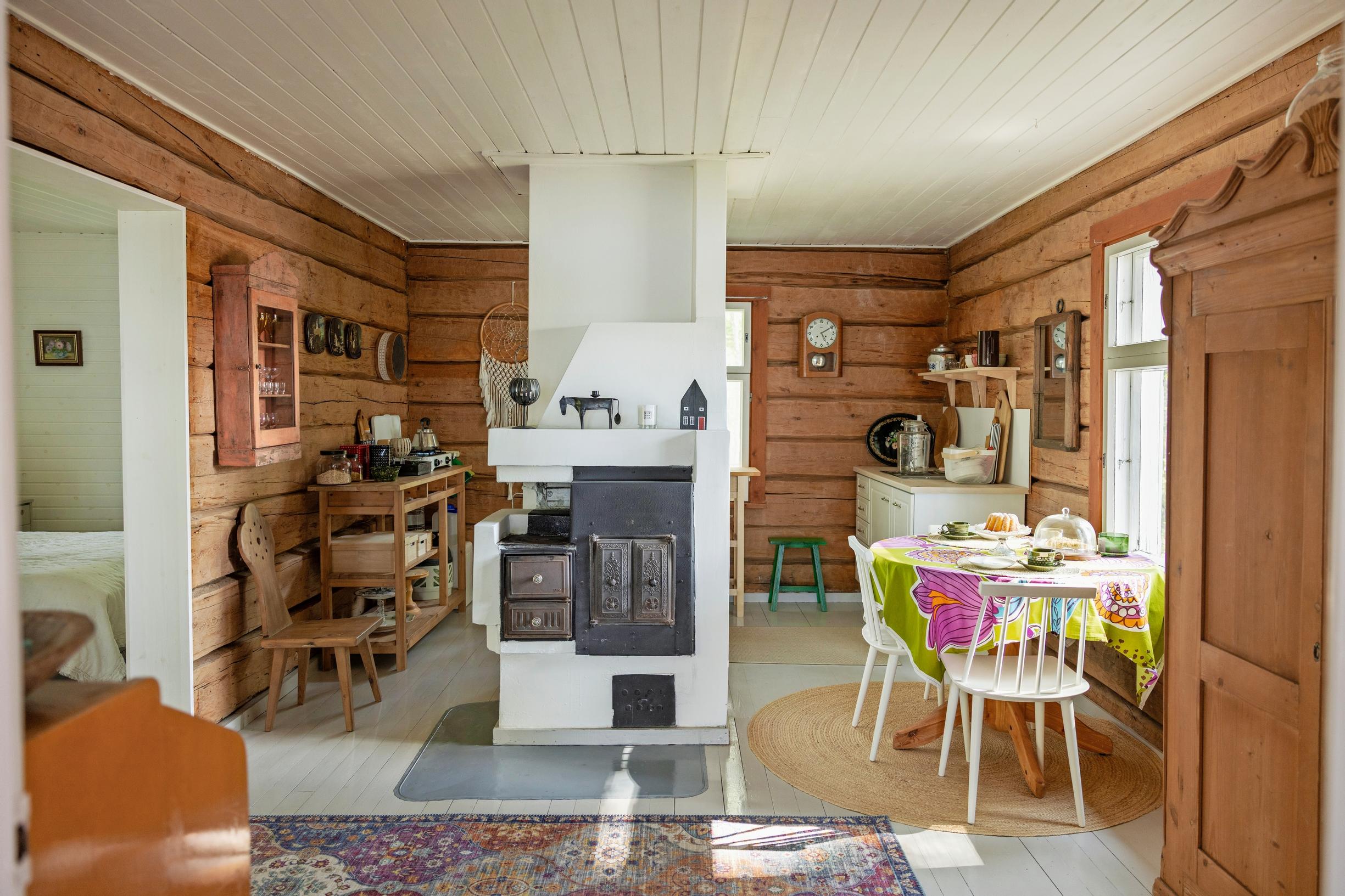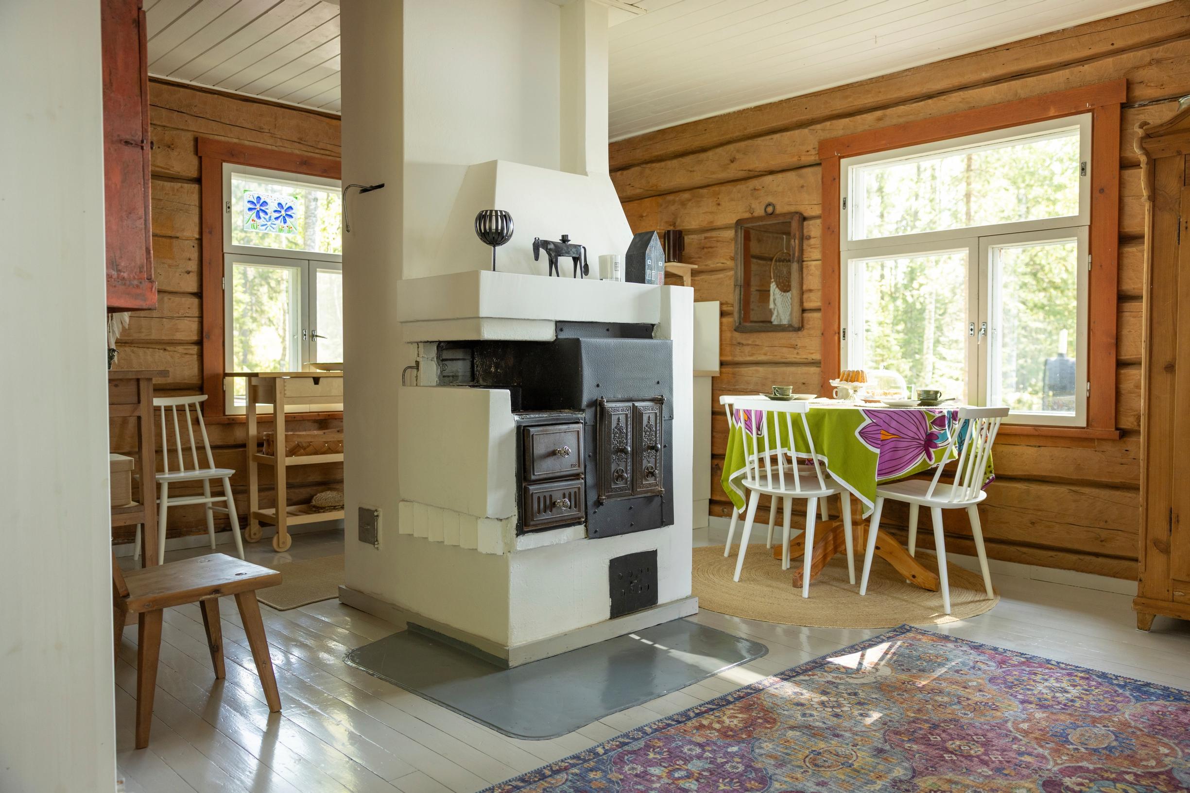 Inside Jaana’s log cabin, everything in the main room is old or reclaimed: “I’ve never seen a stove like this anywhere!”