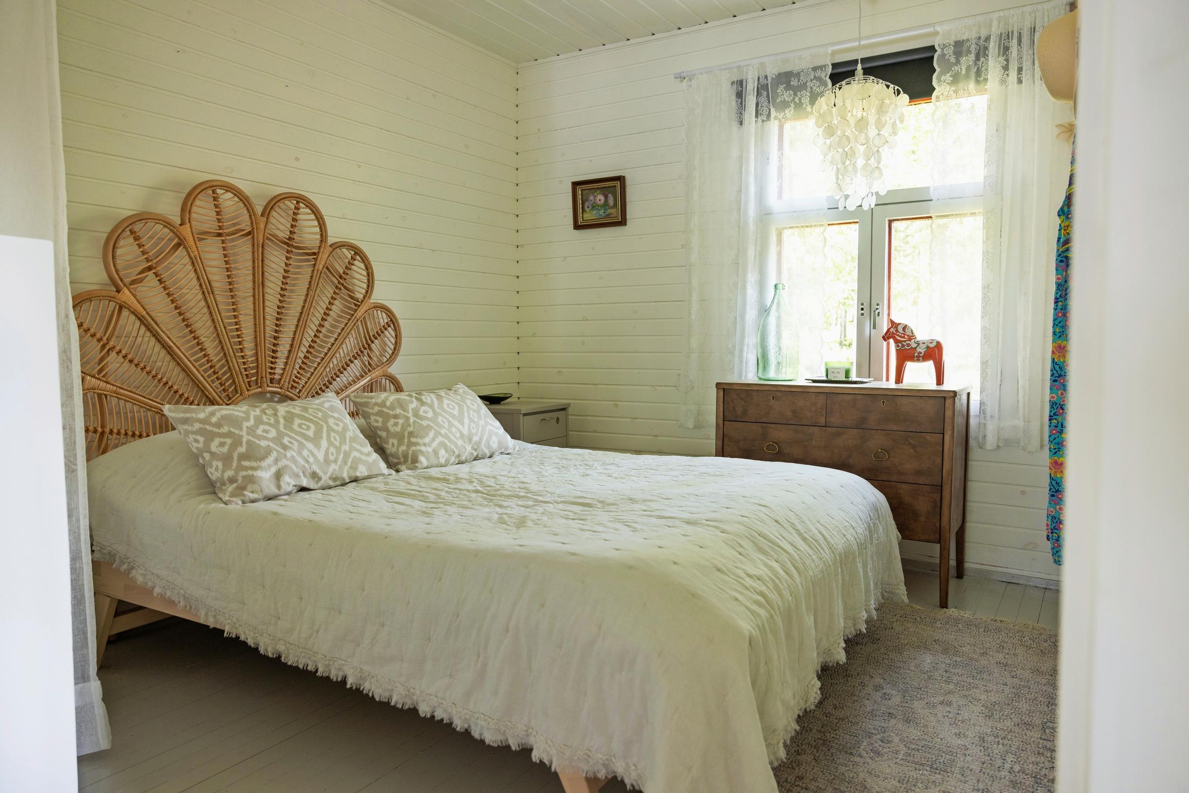 The 1950s rocking chair belonged to Jaana’s mother, who also passed down the small floral painting in the bedroom.
