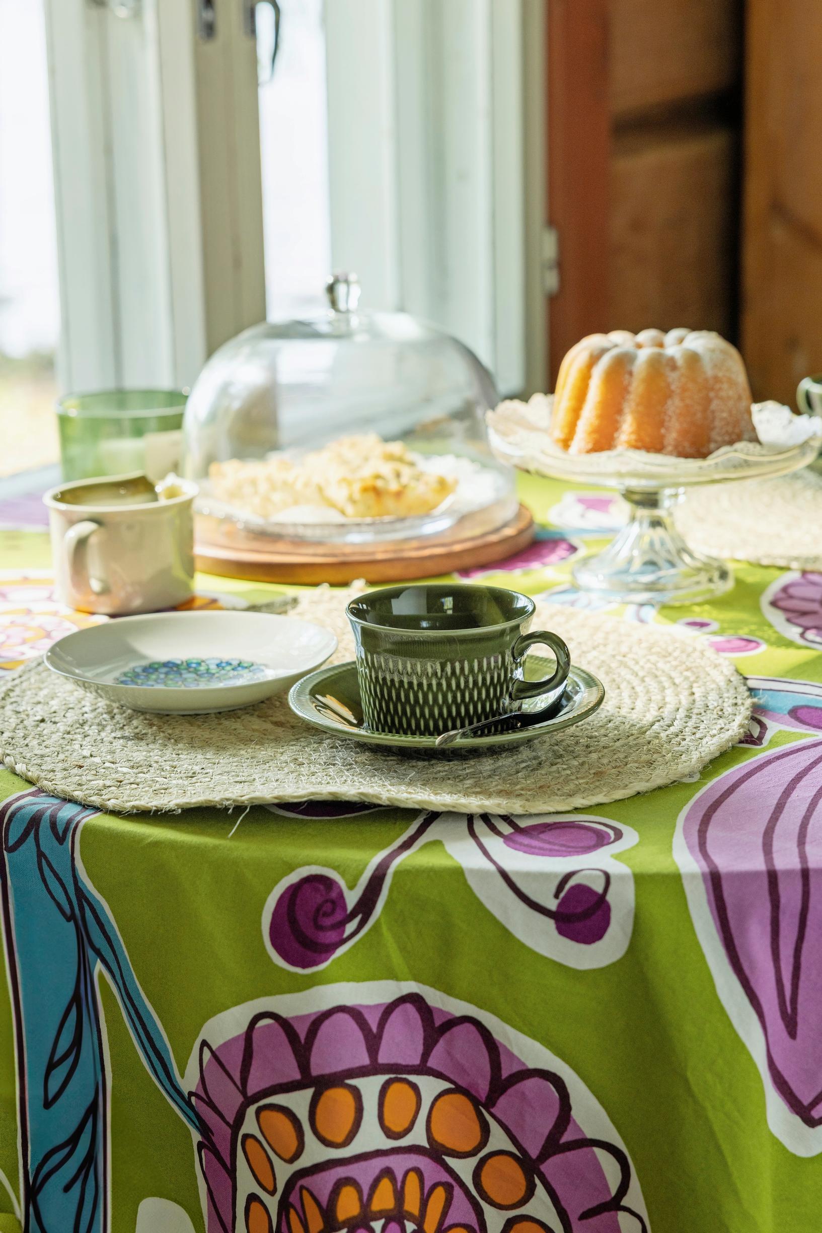 In three years, so much has changed. Jaana is immensely proud of the cabin she bought and how it looks now. Sunlight pours into the log-walled main room, and just beyond the window stretches the broad expanse of Lake Ontojärvi. A round table is topped with a colorful, large-flowered 1960s cloth, and the mood comes from many beautiful old heirloom pieces.