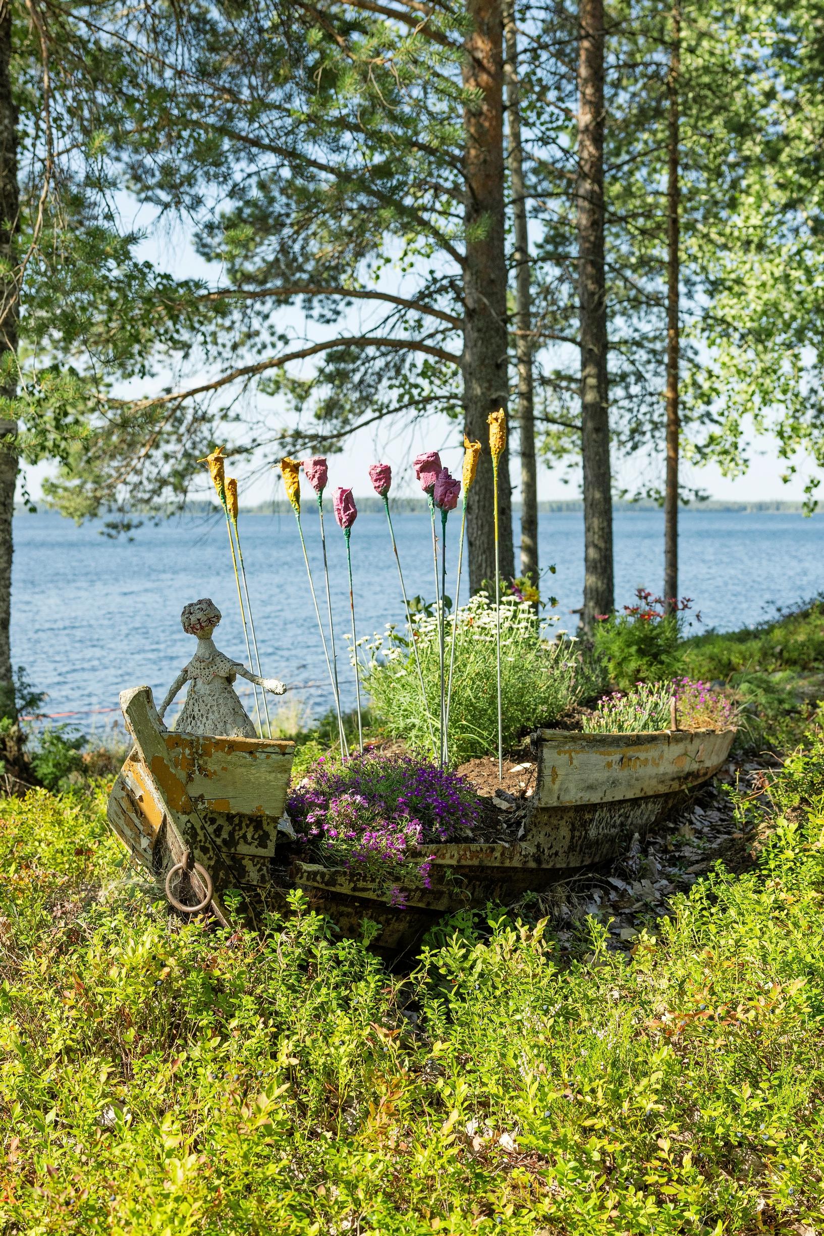 It’s clear from the yard and the cabin that Jaana is an active member of the adult education center and several hobby groups. She casts decorations in concrete, works with glass and clay, bends iron, weaves, knits, and sews. The hand-formed ceramic vase on the deck table is full of white roses.