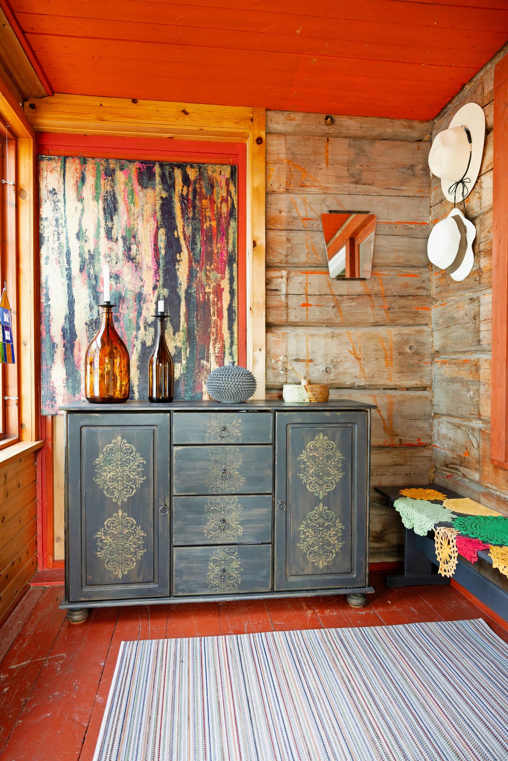 While waiting to move into the cabin, Jaana restored and had someone restore her heirloom furniture, combed flea markets, and kept an eye on dumpsters. In the main room, everything is old or reclaimed.