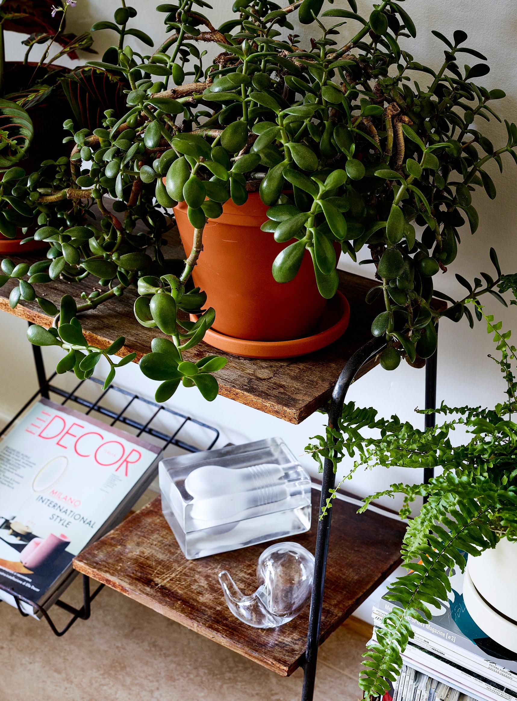 The jade plant thrives in a small pot. Plant it in a heavy clay pot. If you have trouble getting the plant to stand upright, place the pot inside a larger cachepot, and add stones at the bottom for extra weight.