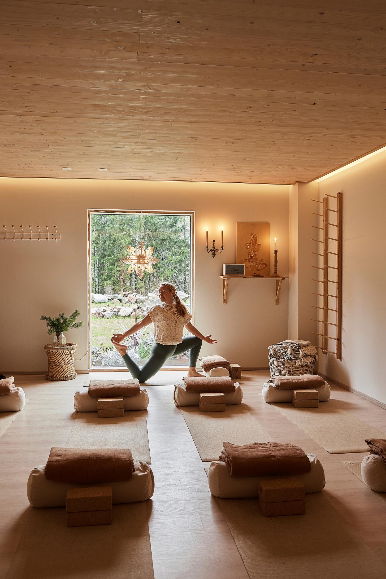 The harmonious atmosphere of the yoga studio is created by natural light from the large window, indirect lighting, wooden surfaces, and soft, coordinating shades.