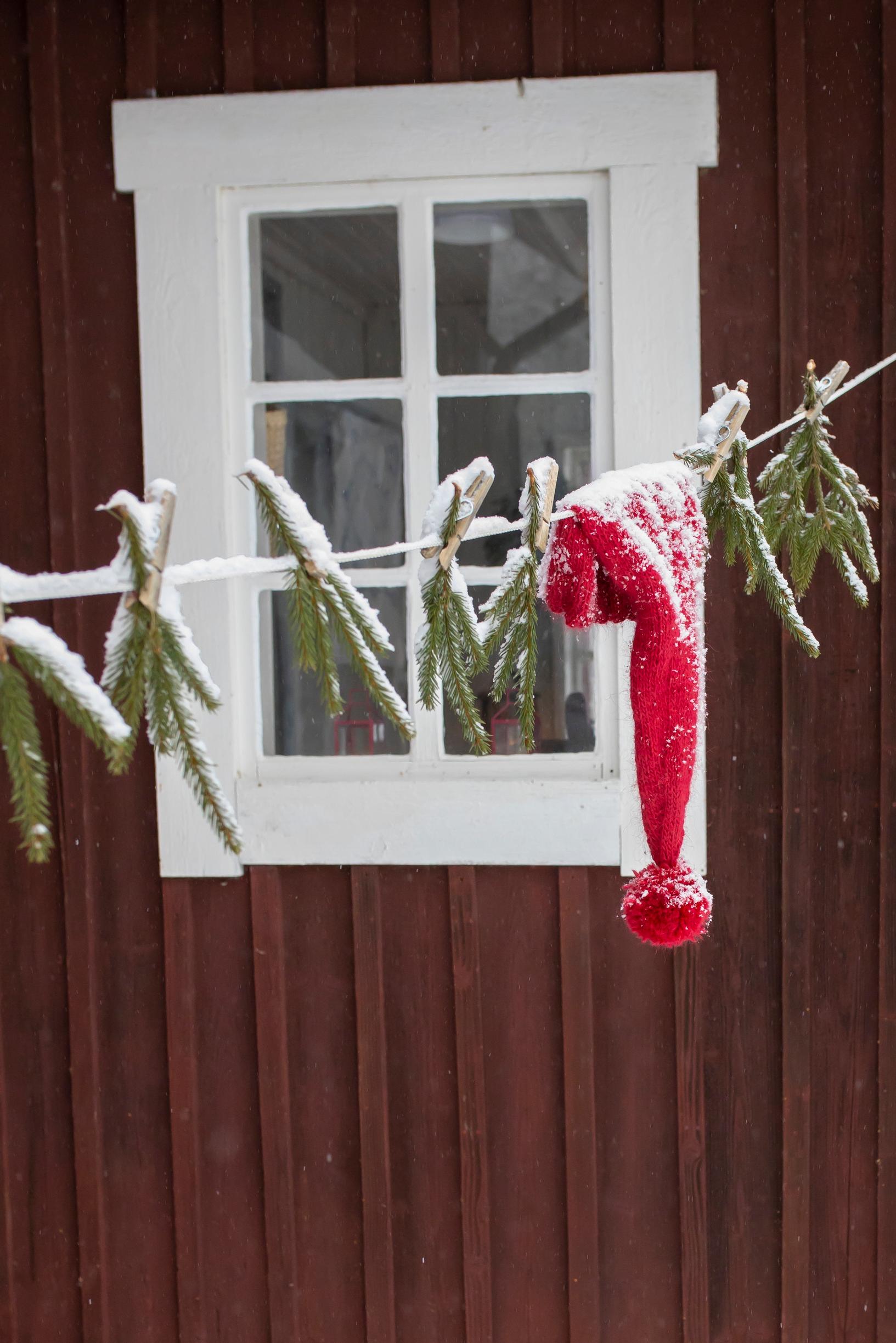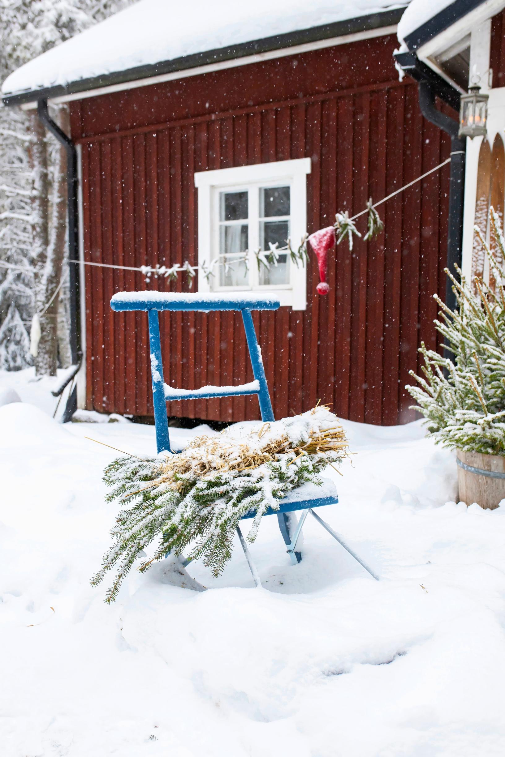 The yard is decorated for Christmas. The cottage is painted with Uula’s Falu red (Falun-punainen) paint.