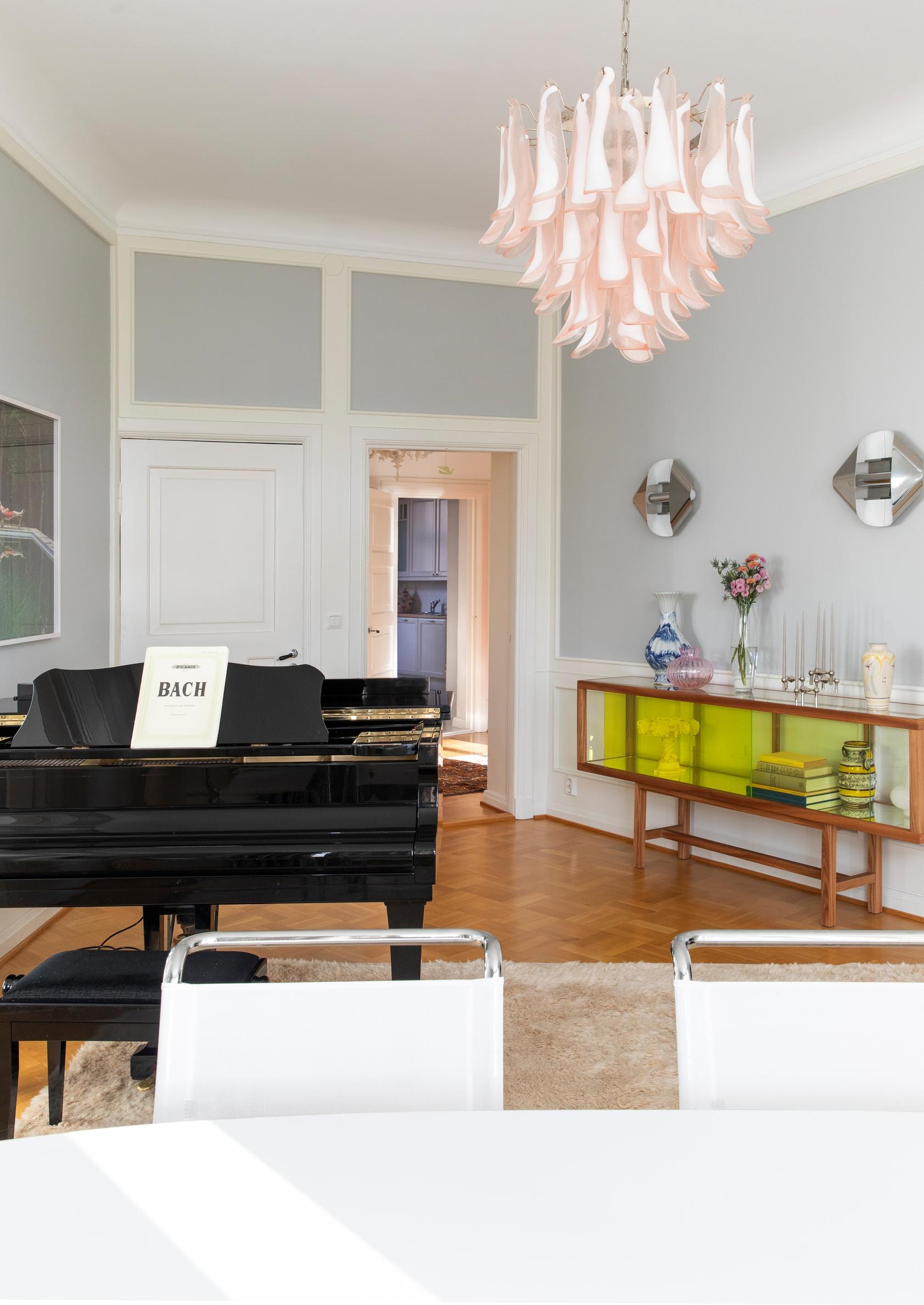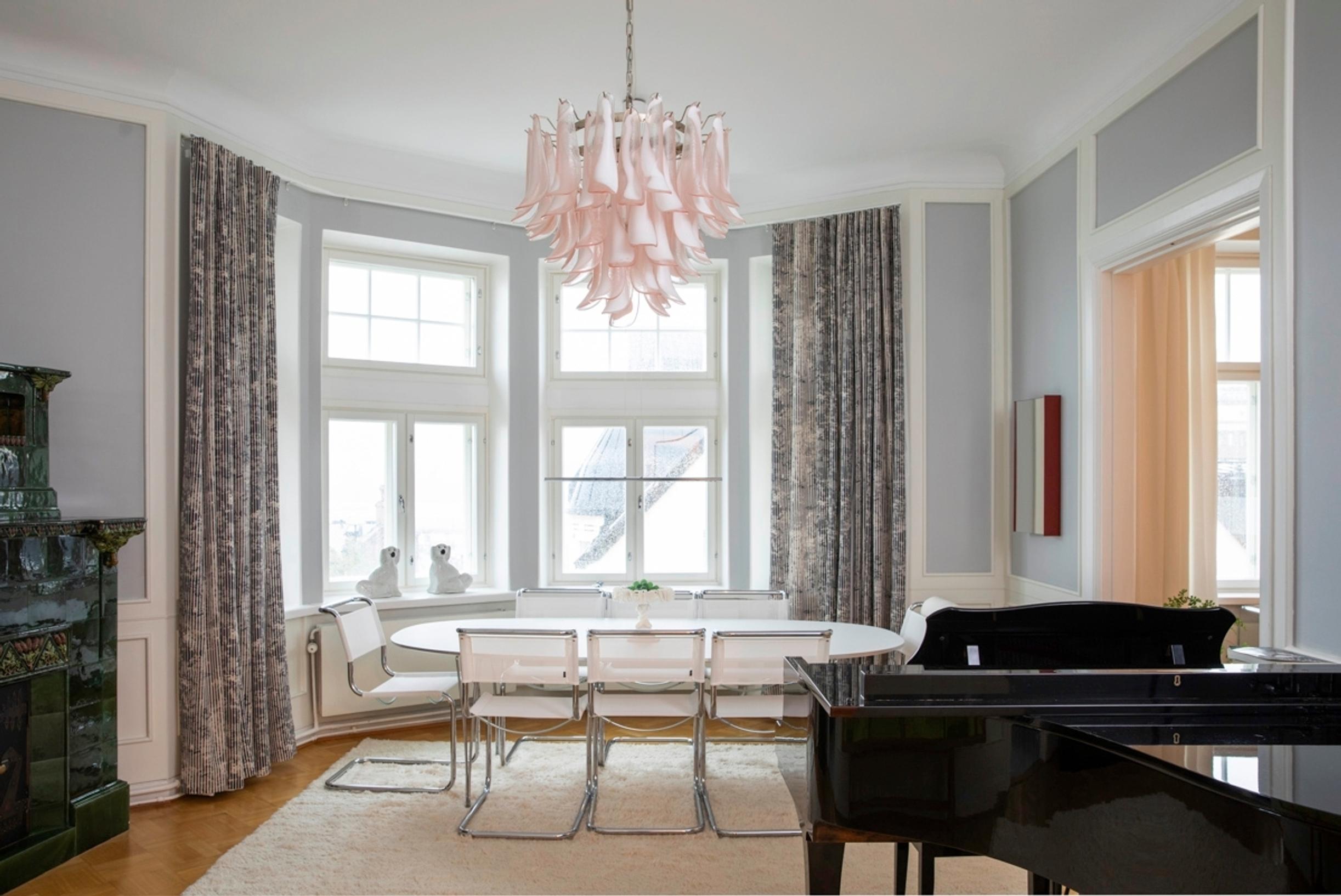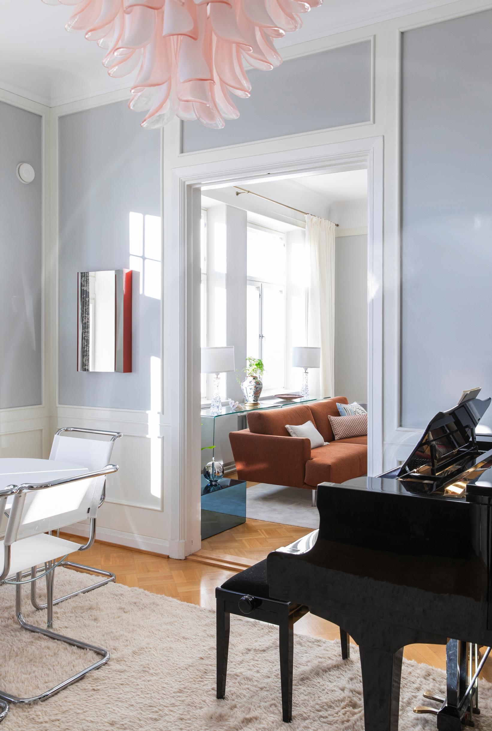 Well-chosen “style breaks” give the home a fresh twist. In the dining room, dubbed the “piano room,” Marika designed a sideboard that combines classical shapes with neon-toned sliding glass doors. Along with modern lighting, it brings classic elements into the present day. The sideboard was built by cabinetmaker Markku Lyytinen from Juuripuu. The Guzzini 1970s wall lamps are from Bukowskis. Murano vintage chandelier from 1stdibs.