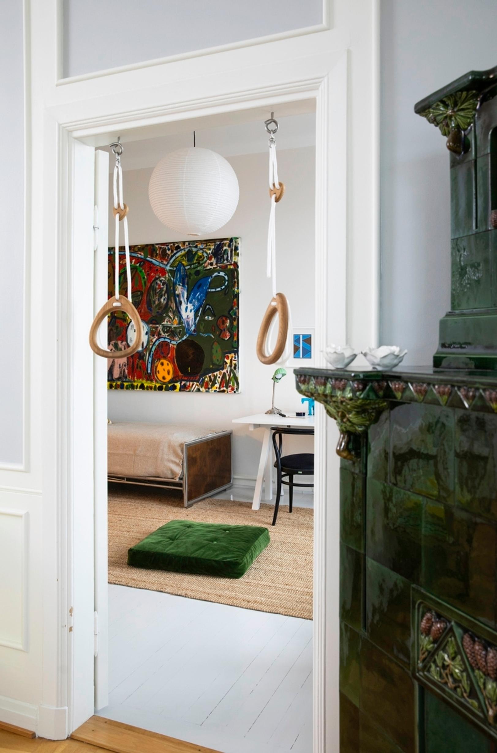 Initially, Marika considered pulling the wall color for the dining room from the original tiled fireplace. However, a dark forest green would have made the color scheme too heavy, and combined with the yellowish parquet, it risked feeling stuffy. Instead, the fireplaces remain unique focal points that reflect the apartment’s history. Gym rings hanging in the son’s doorway are used daily.