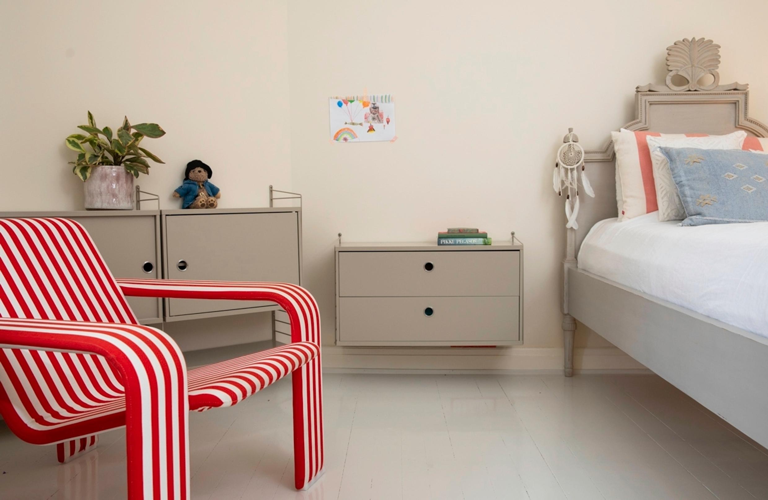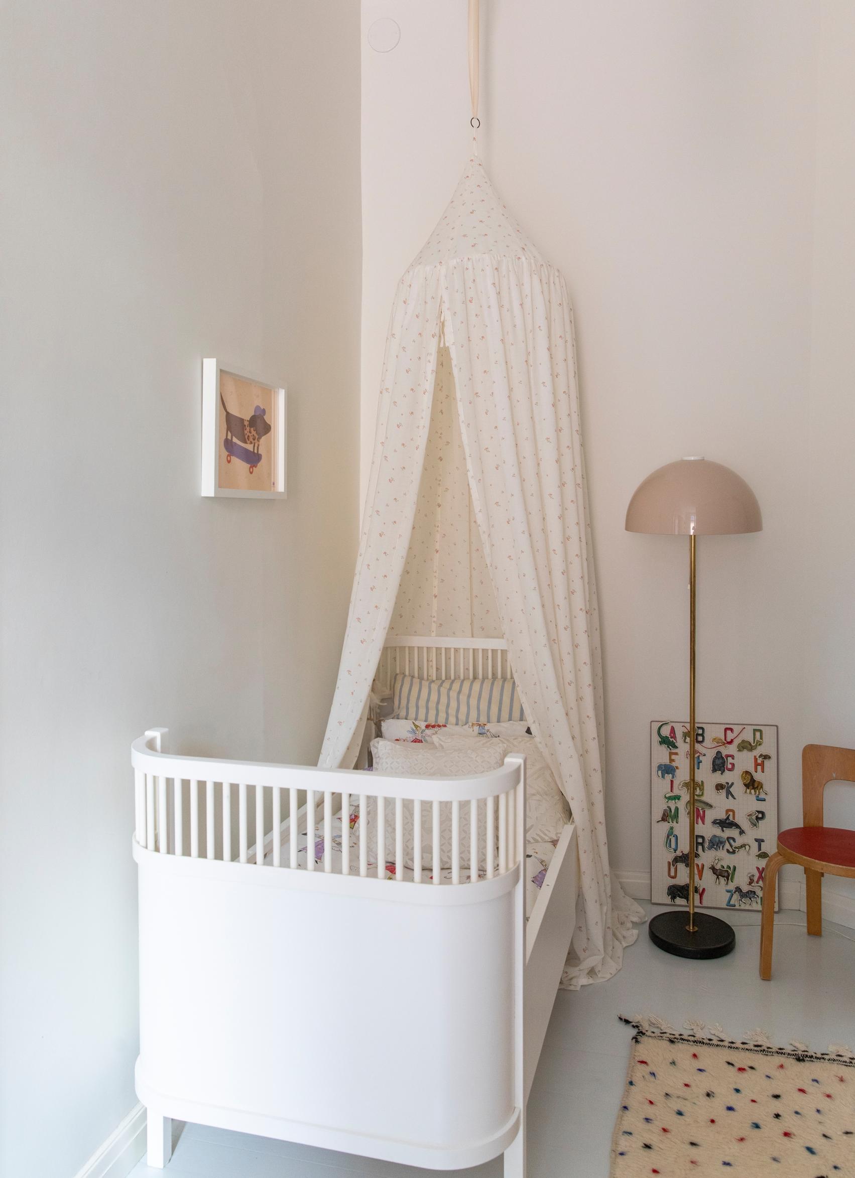 The youngest child’s room, complete with a canopy bed, best captures the feel of a traditional children’s room. While the kids’ needs are considered throughout the home, the décor doesn’t shout “kid-friendly.” Every design choice was approved by the children. The Sebra bed, bought secondhand from a friend, grows along with the child.
