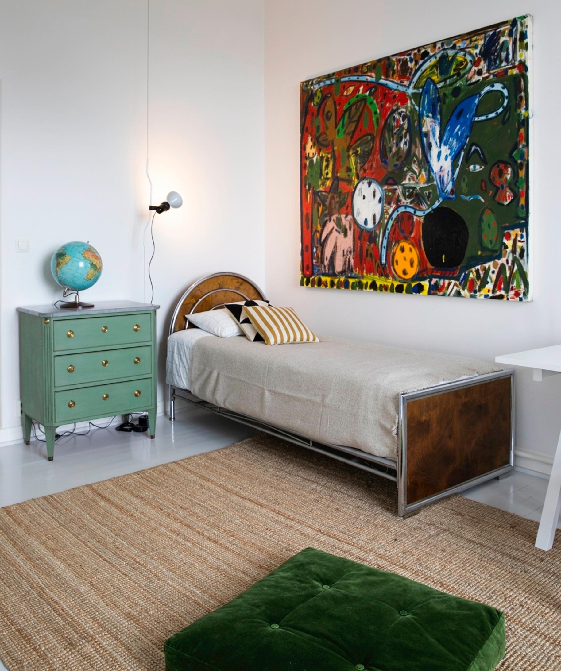 In the oldest child’s room, the art deco bed pairs elegantly with a Gustavian chest of drawers and a 1970s Flos Parentesi lamp purchased at Bukowskis. The large painting by Tuukka Tammisaari unifies these elements into a cohesive whole. The bed is part of Merivaara’s early production, likely designed by Pauli Blomstedt.