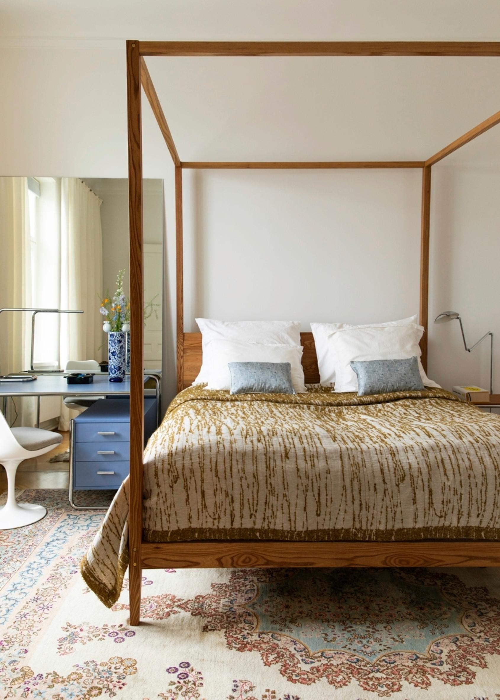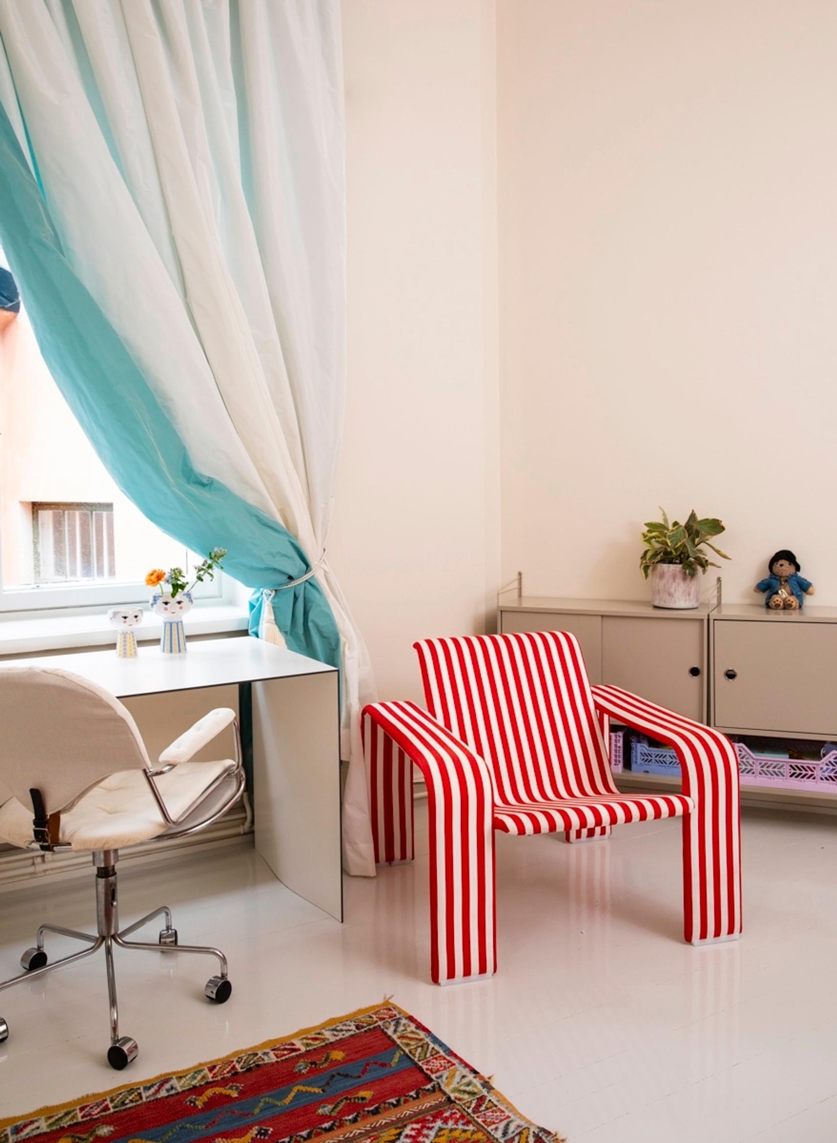 In the daughter’s room, Marika designed “princess drapes” at her request, but with a modern interpretation that pleases both the mother and the elementary-school-aged daughter. Antti Nurmesniemi’s 1980 postmodern armchair 004 balances out the princess vibe. Its size is perfect for bedtime stories—one adult plus two children fit comfortably. Tobias Berneth’s Thinner desk adds a 2000s design layer.