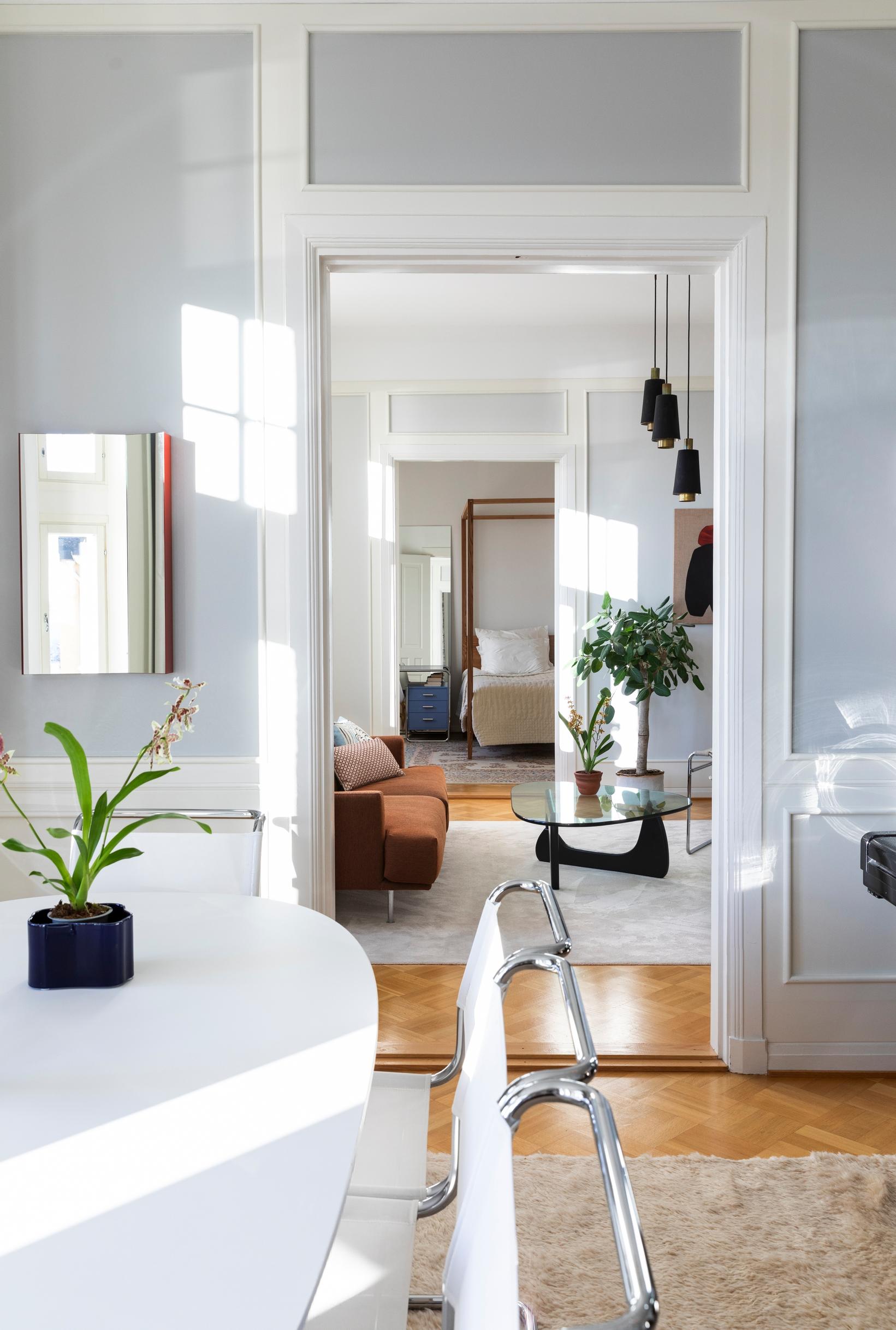 The coordinated wall moldings Marika designed for the dining room, living room, and hall look right at home in an Art Nouveau building. The goal was to make the moldings appear original, so they were painted in a yellowish white found on the apartment’s original paneled doors. The asymmetric mirror is the Mimesis 70 Basque Red by Please Wait to be Seated. Dining chairs by Thonet, rug by Nanimarquina.