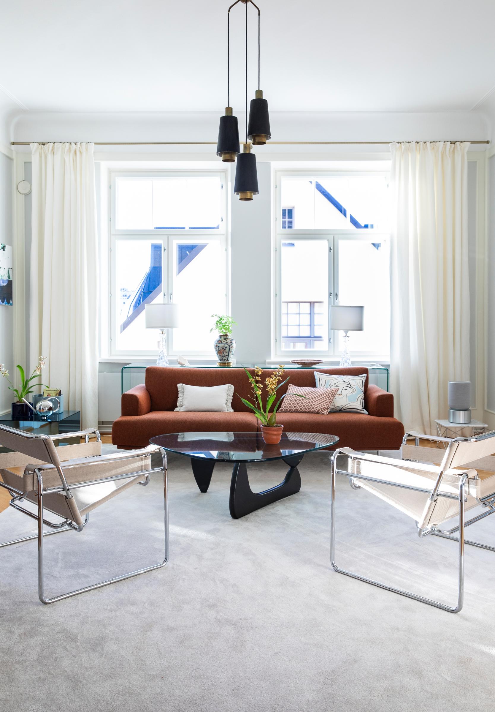 This interior is a blend of custom-made, secondhand, and new pieces. The Cassina sofa was found at Bukowskis, already reupholstered. The mirror-top table was custom-made by Lasilinkki. Wassily chairs by Knoll, Artek. Noguchi table by Vitra.