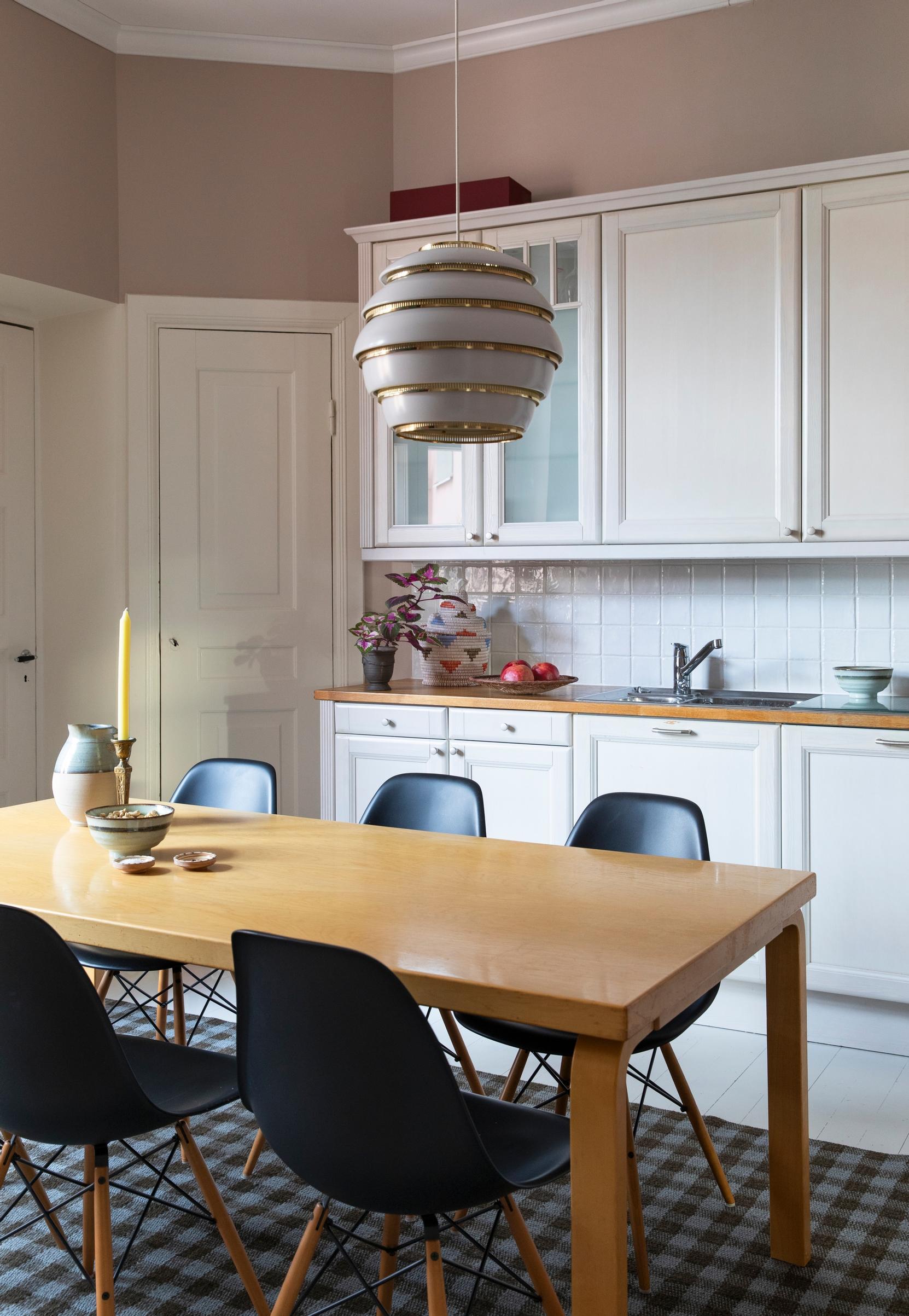 Because their previous home was nearly 100 square meters (1,076 sq ft) smaller, they needed many additional furnishings and had to prioritize their spending. The kitchen, newly renovated by the former resident, remained unchanged, even though it didn’t quite feel like theirs. Keeping it was also the more ecological option. The time for a kitchen renovation will come later. The Artek dining table is from Kirsi’s childhood home. The Aalto Beehive pendant lamp and Vitra chairs were originally purchased from Artek.