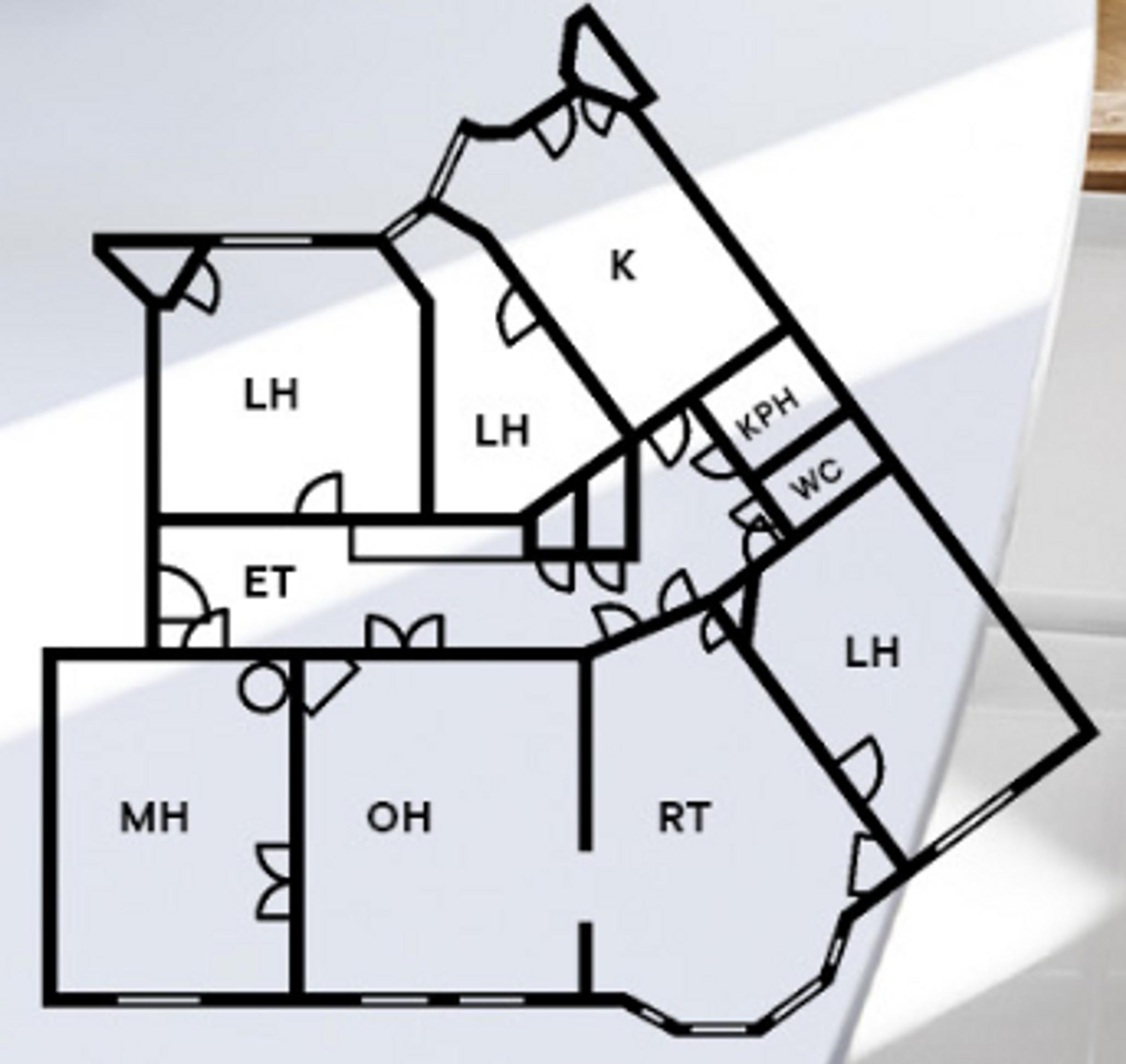 The yellowish oak parquet that made Kirsi and Jussi hesitant was made to look good by choosing the right wall color and a large rug.