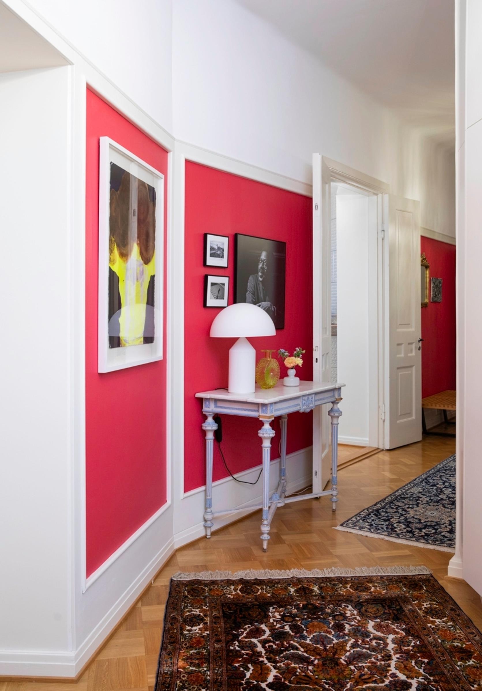 The entryway sets the tone for this refined home, so they wanted it to be eye-catching. Marika noticed the raspberry-colored walls in a Beck film. The shade NCS S 1070-R10B was chosen after careful testing. The result is a modern, suitably bold raspberry hue that doesn’t make the space feel dark. To keep the look contemporary, the color extends only within the boundaries of the moldings. The same idea is applied to other rooms with moldings. On the console table is the Atollo lamp by Oluce.