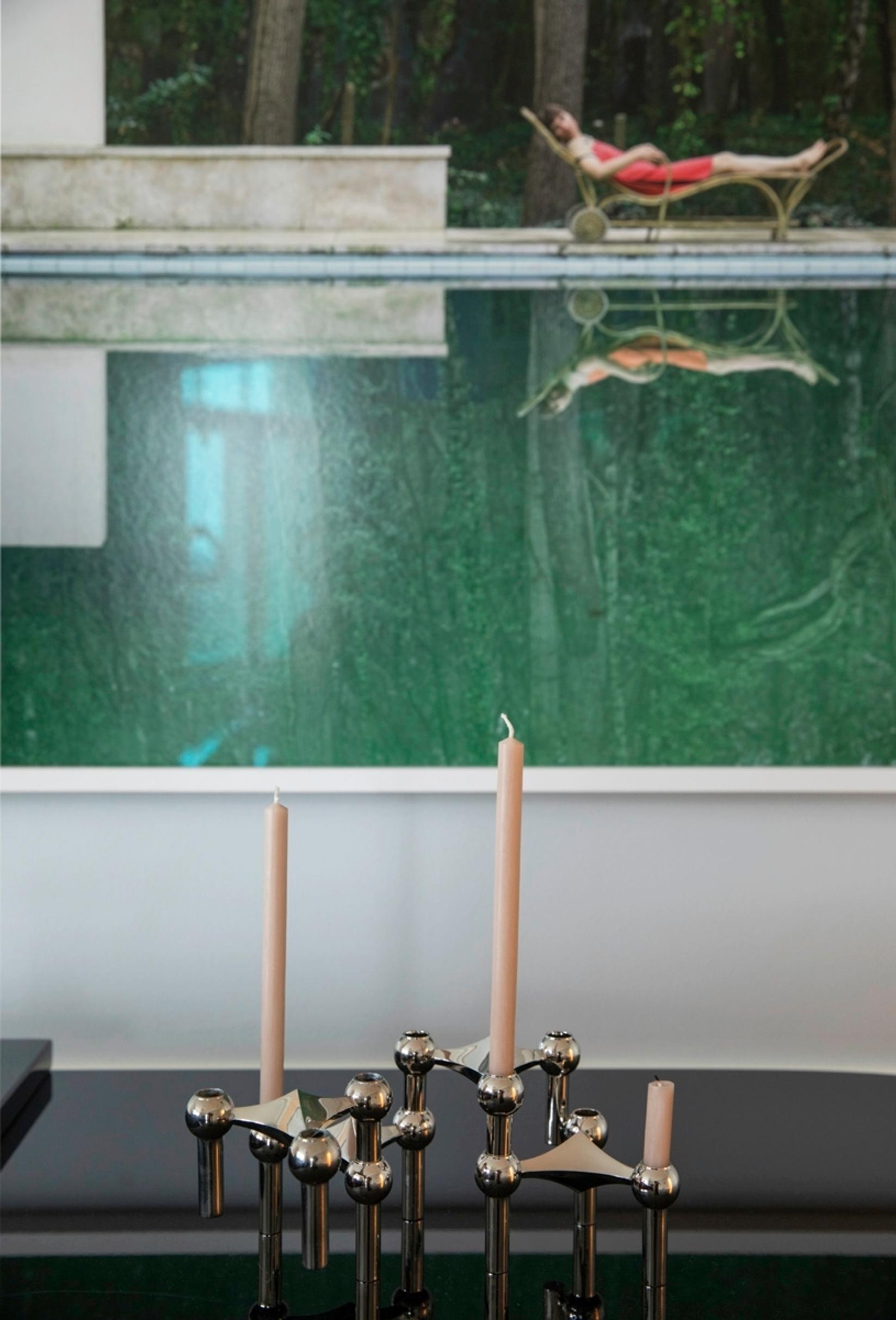 Both the residents and Marika value the layered look that brings intrigue to the interior. The personal meanings associated with these artworks add an inspiring dimension to Kirsi and Jussi’s home. Together with furniture and lighting of different ages and styles, they create an atmosphere with a hint of the unexpected. The photo is by Elina Brotherus. The chrome candelabra is by Stoff Copenhagen.