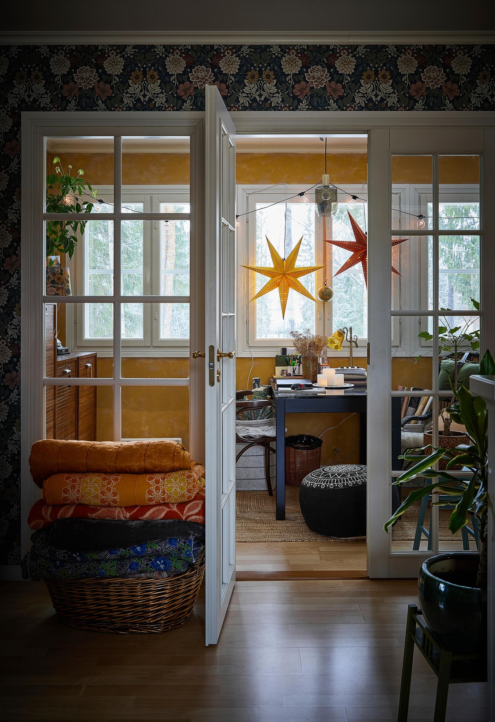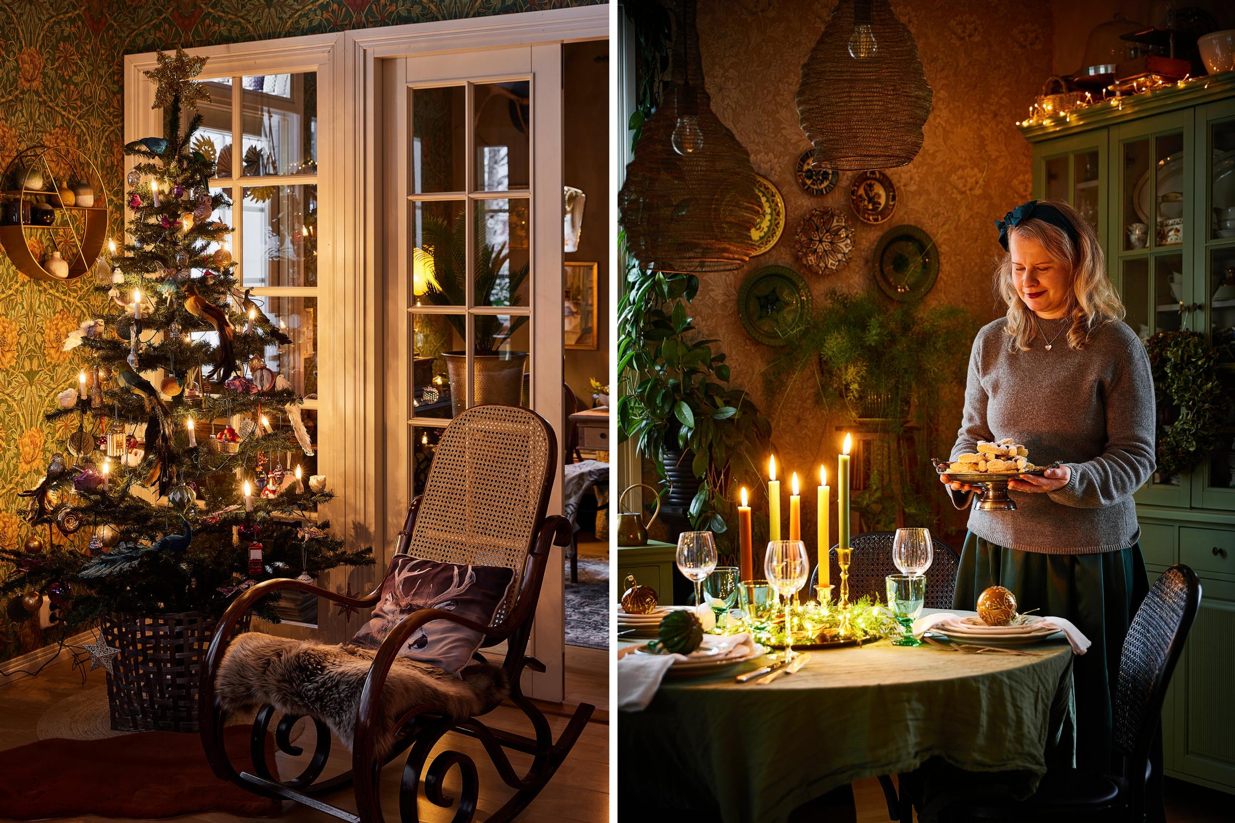 Inside a yellow mansard-roofed wooden house, the scent of mulled wine drifts in the air while candles flicker. The aroma of cinnamon and orange also lingers, as the mossy arrangements are embellished with cinnamon sticks and dried citrus slices. Green hues appear throughout the home in the wallpaper, houseplants, furniture, and textiles. Kirsi Välimaa and her daughter Oona build their Christmas around a green color theme.