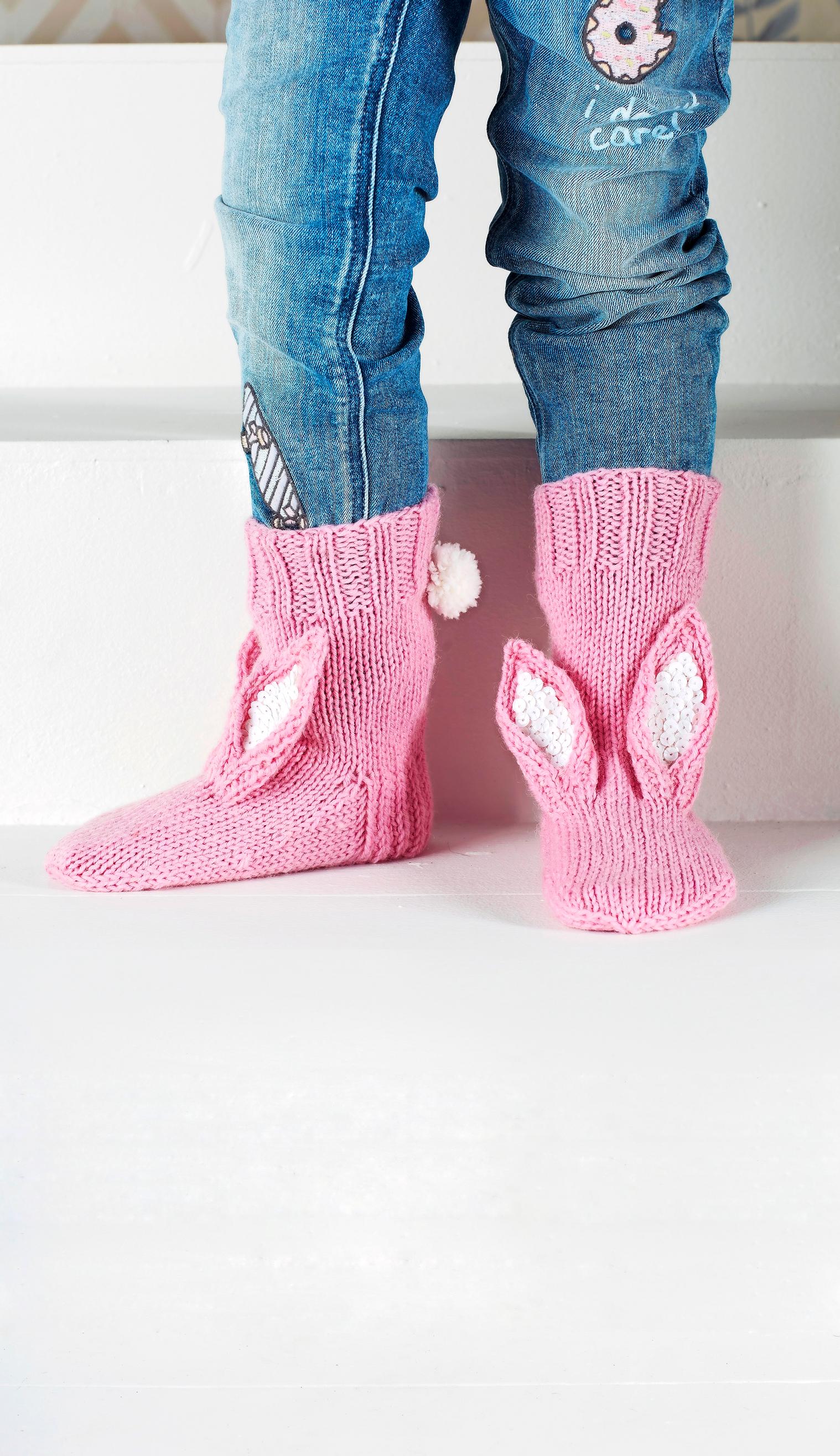 These lovely Bunny socks are knit with pink and white yarn. If you’d like, you can decorate the bunny ears with sequins for some extra bling. As for the tail—it’s a pom pom, of course!