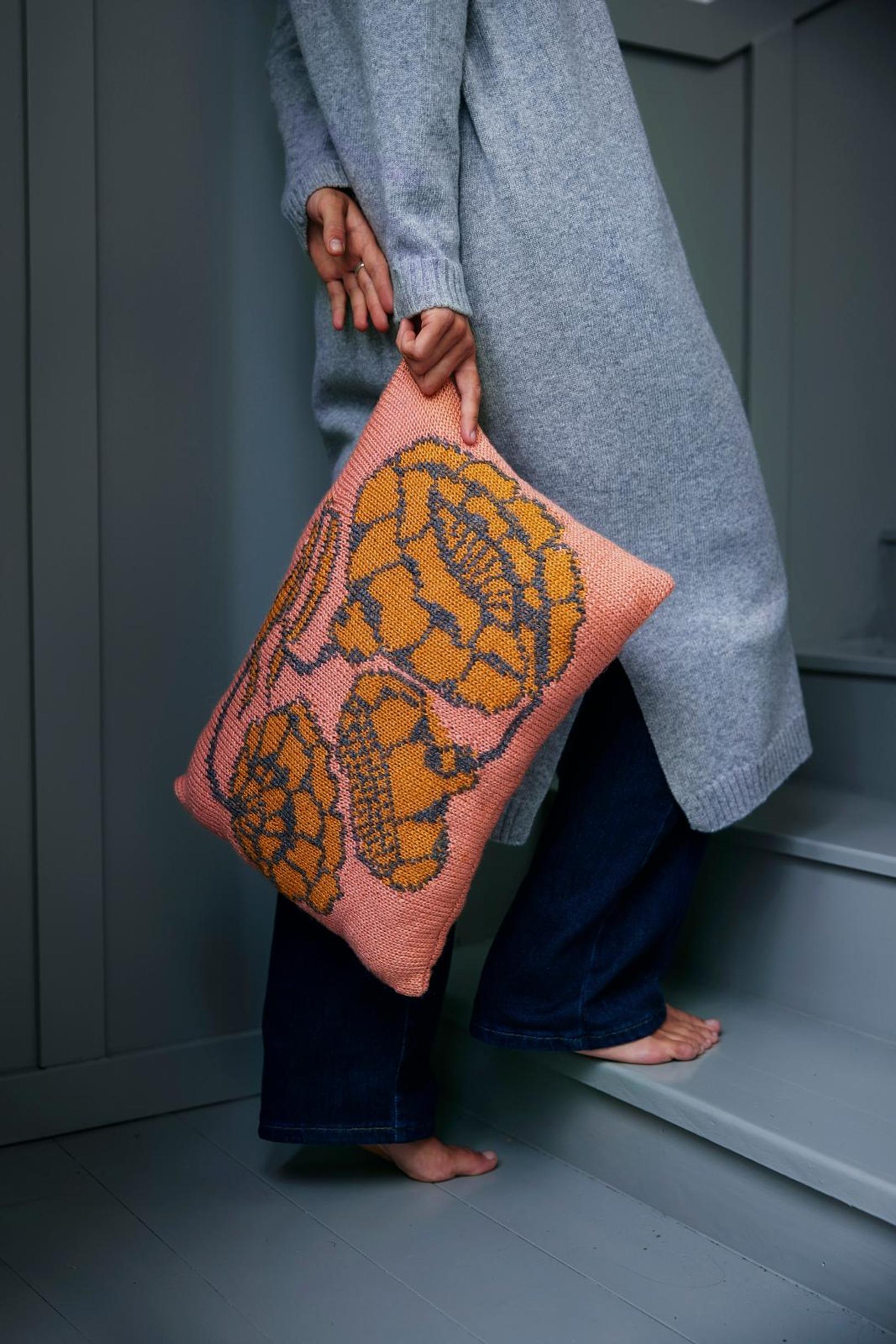 This peony-themed Pioni cushion is worked using the intarsia technique, creating a striking floral motif. If you prefer, the finished piece can easily be turned into a stylish bag—two projects in one!