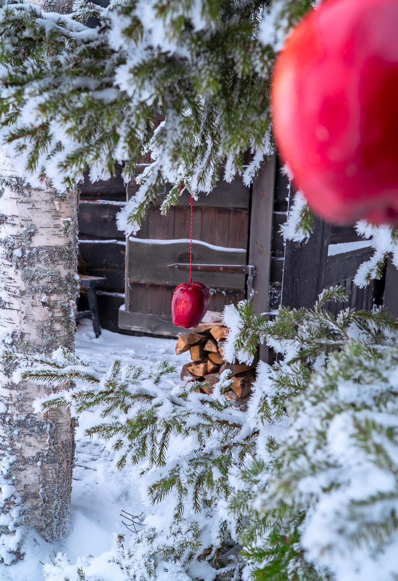 Tiina and Kari lay a covering of spruce branches in front of the smoke sauna steps. Then, with the whole family pitching in, they hang rosy-cheeked apples on the branches of the Christmas tree. It’s time to settle into a peaceful Christmas at the cottage.