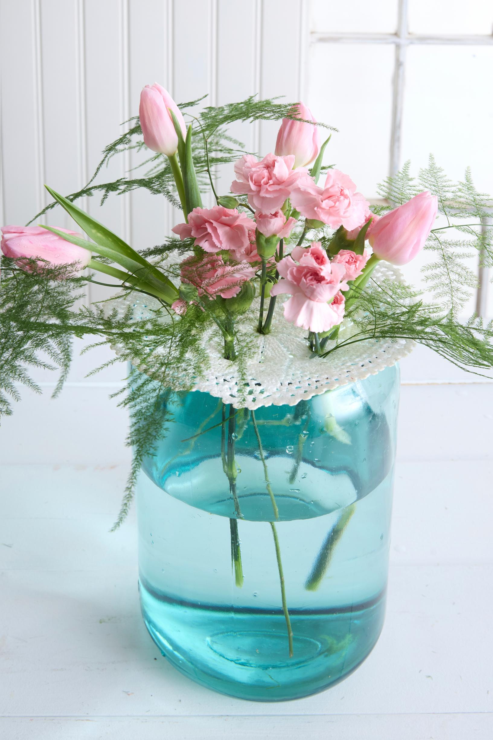 - Place the doily over the mouth of a vase and thread the stems through the openings.