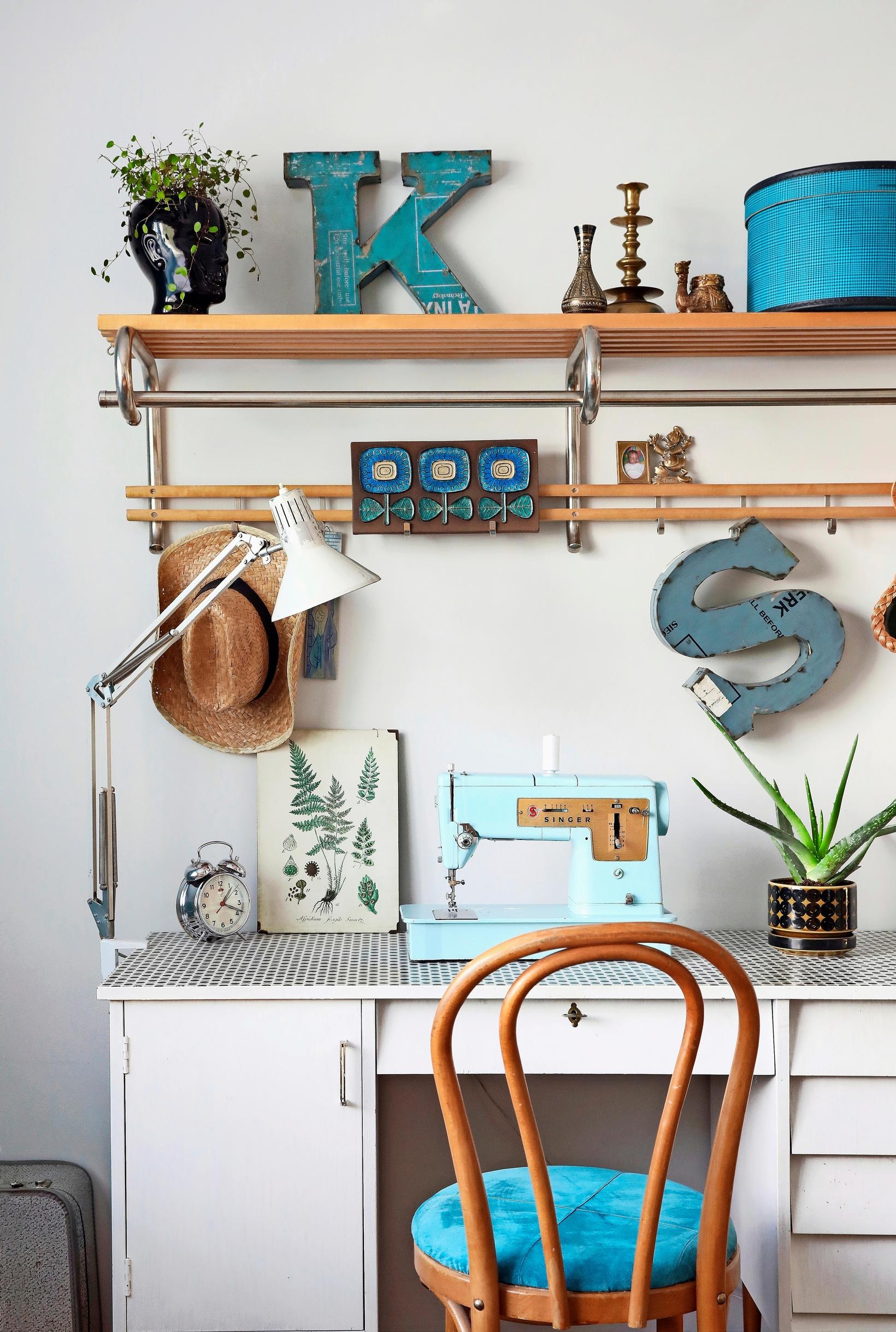 The classic Lahden Naulakkovalmiste coat rack works far beyond the entryway. Mounted above a crafting station and home office, it adds storage space and frames the setup. The shelf can hold houseplants, binders, and storage boxes. Use the rack to hang decorative pieces or baskets. In autumn, decorate it with seasonal lights.
