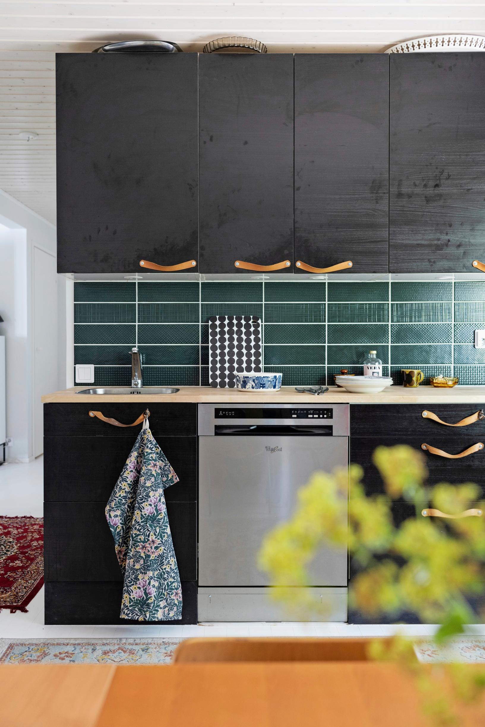 Essi and Mikko received kitchen cabinets for their cottage from a friend who had upgraded to new ones. The cabinets now store dry goods. The doors are finished with leather pulls.