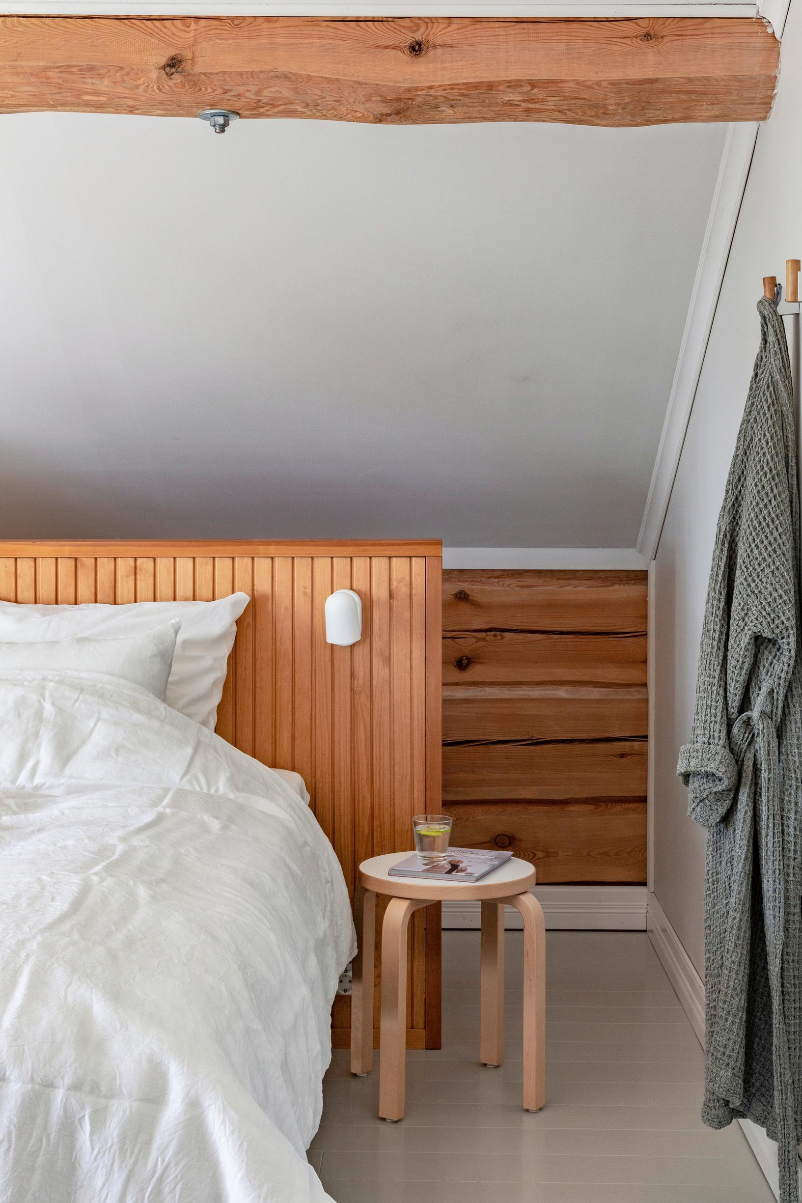 The timber-framed headboard is clad in surplus floorboards and tongue-and-groove paneling in Antti Kuha’s log house by the Tornio River. The headboard is waxed in an oak tone. The frame is wired for reading lights.